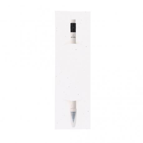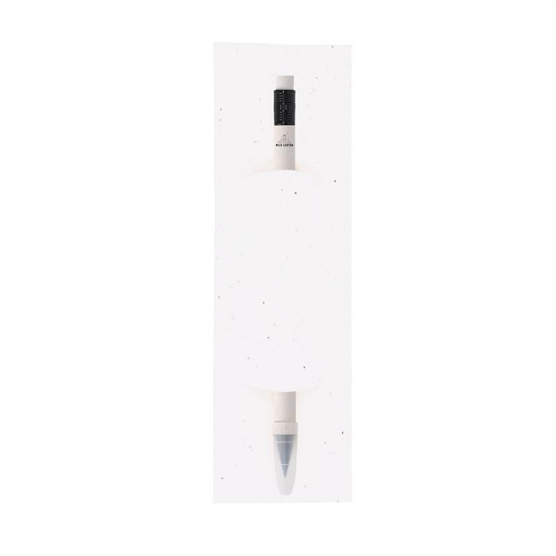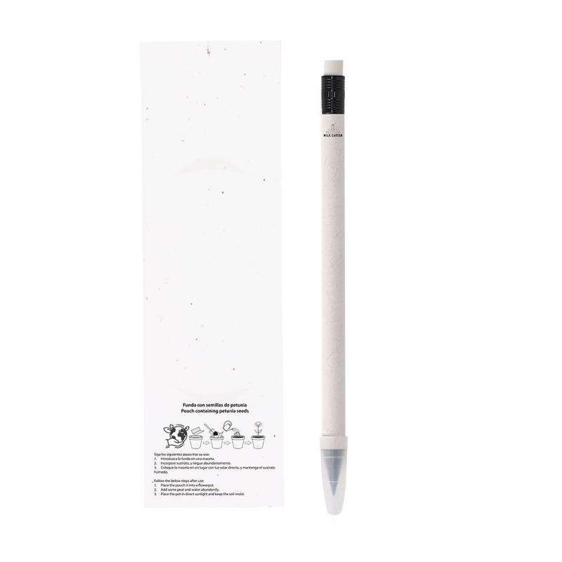 Lápiz eterno fabricado con cartones de leche reciclados, presentado en funda de papel con semillas. Reutilizable y con escritura infinita. Incluye goma de borrar en la parte superior del lápiz y capucha de protección. De color blanco, con detalles en negro. Con distintivo de cartón de leche reciclado en el cuerpo. La funda incluye semillas de petunia, convirtiéndolo en papel plantable al final de su vida útil. Incluye instrucciones de plantado en la cubierta trasera.Los Cartones de Ceche se componen en su mayor parte de cartón y aluminio. Durante su proceso de reciclado, se separan los distintos materiales del envase para su reutilización y nuevo uso, contribuyendo así a recorrer el camino infinito de la economía circular. Este material se caracteriza por su alto grado de reciclabilidad, así como por su ligereza y resistencia.