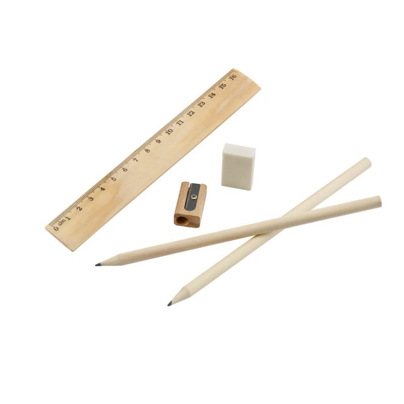 Juego de escritura que incluye una regla de 16.5 cm, dos lápices de grafito (HB), una goma de borrar y un sacapuntas. Se entrega en una bolsa de tela no tejida (80 g/m²) con cierre de cordón. 60 x 265 mm