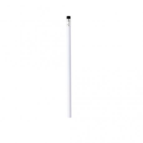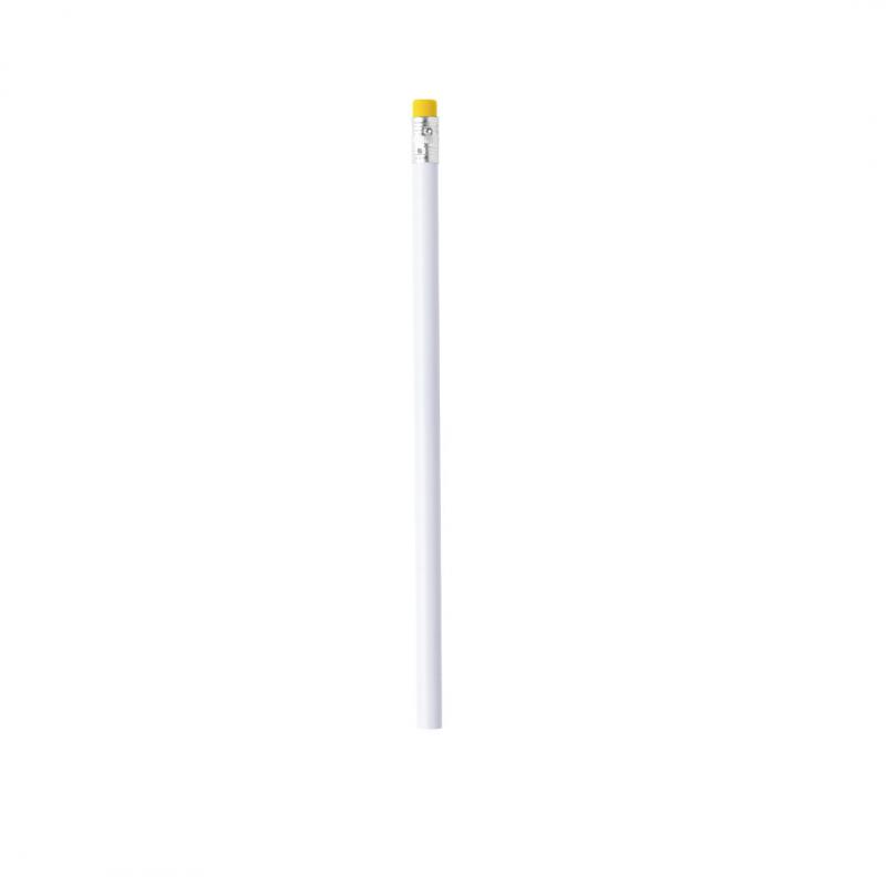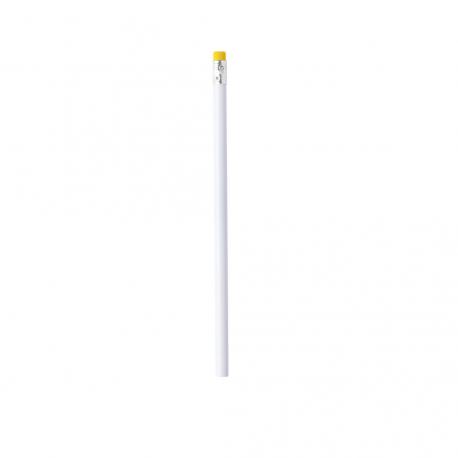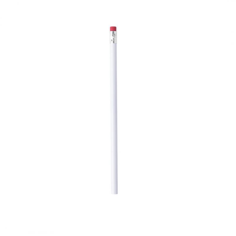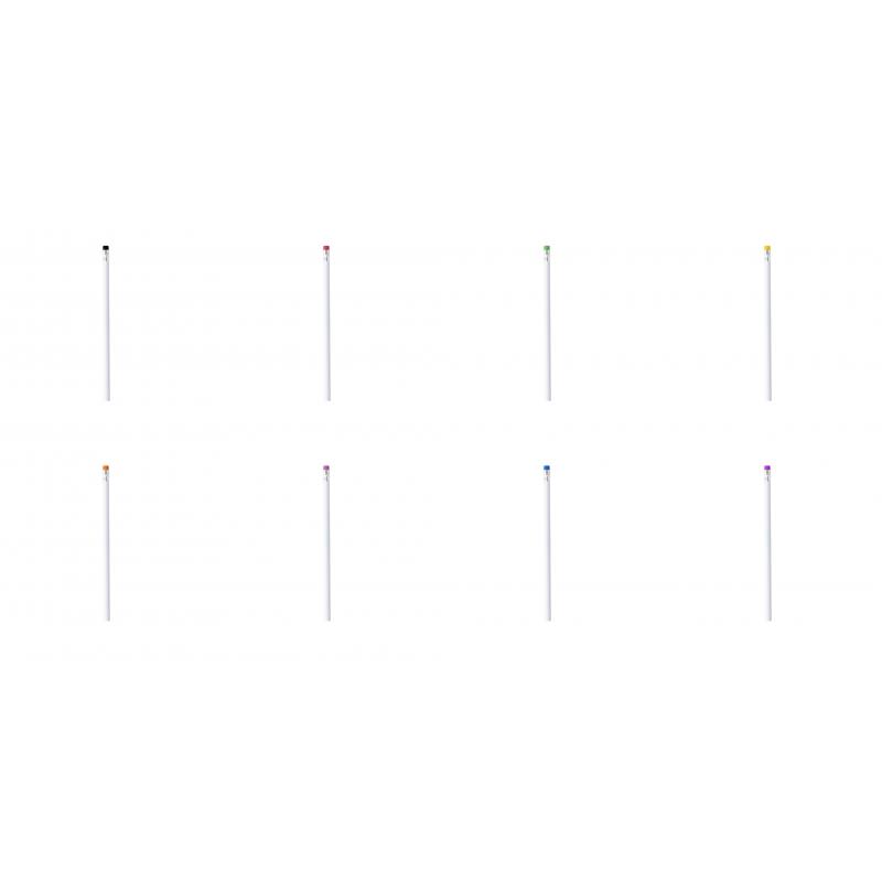 Lápiz de madera en color blanco y de acabado brillo. Con cuerpo redondo y goma de borrar disponible en variada gama de colores. Mina negra y punta sin afilar.