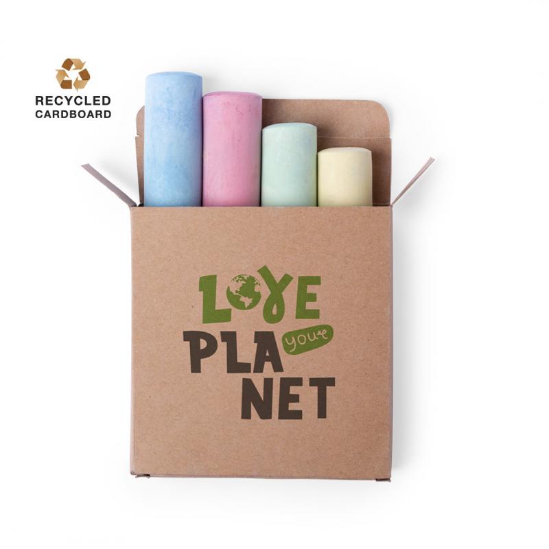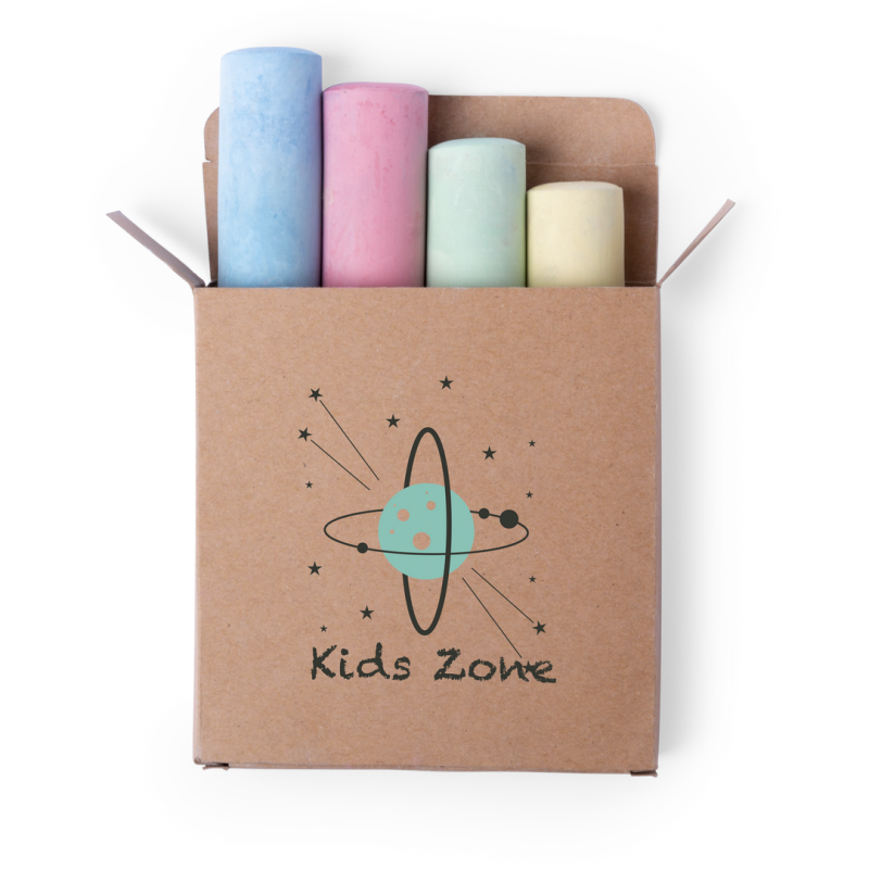 Caja de tizas tamaño XL. Estuche en cartón reciclado, con 4 tizas en colores azul, rojizo, verde y amarillo.