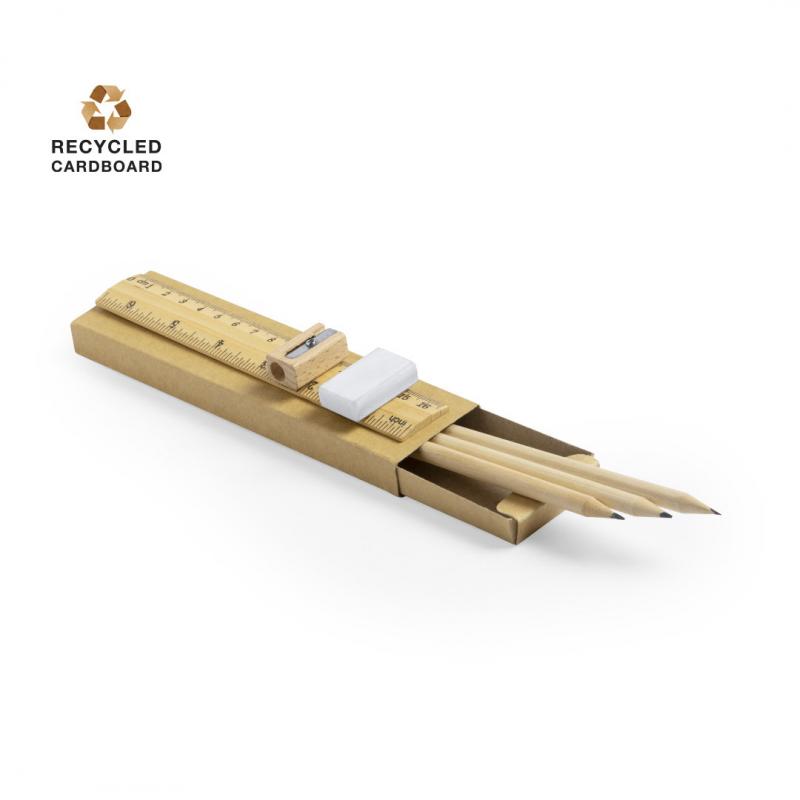 Set de 6 piezas con 3 lápices de madera con cuerpo redondo de acabado natural y mina negra, regla de 20cm con sistema métrico en centímetros/pulgadas, goma de borrar y sacapuntas. Presentado en estuche de cartón reciclado.