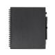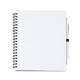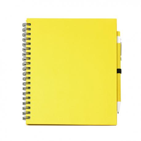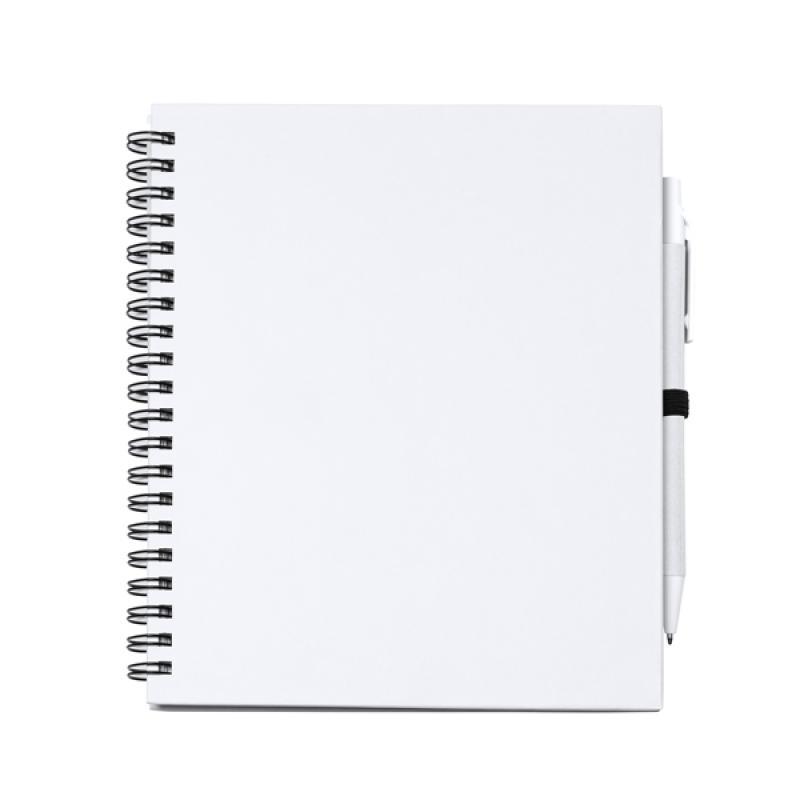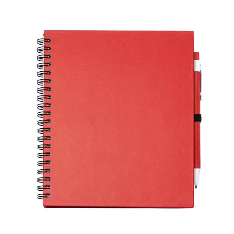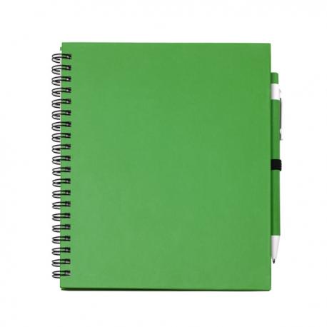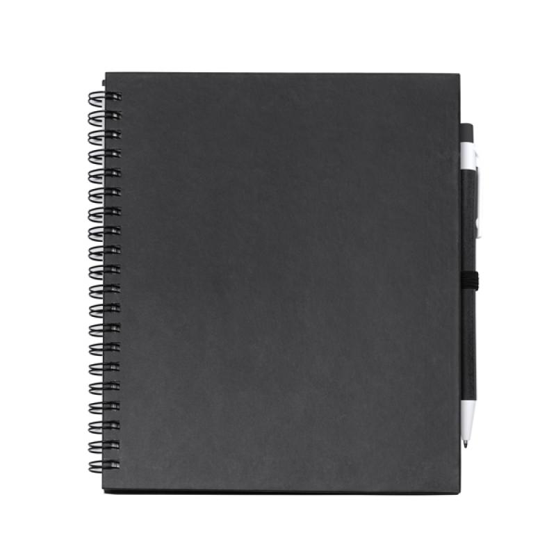 Libreta con espiral, compuesta por 70 hojas de papel liso y soporte para bolígrafo. Tapas rígidas y bolígrafo de cartón reciclado a juego.