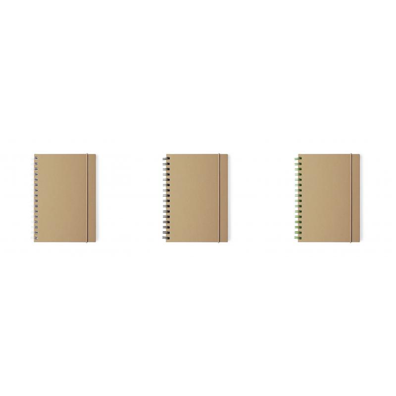 Libreta con anillas de color en línea nature. Con tapas rígidas en cartón reciclado y elástico de cierre en colores naturales. Con 80 hojas de disposición a una raya y diseño eco.