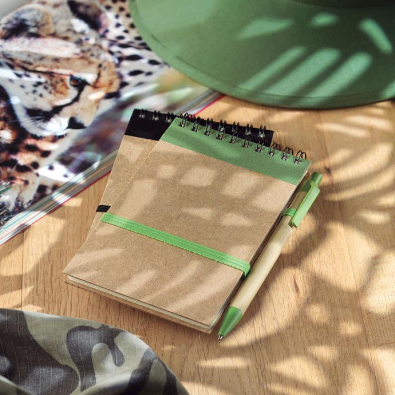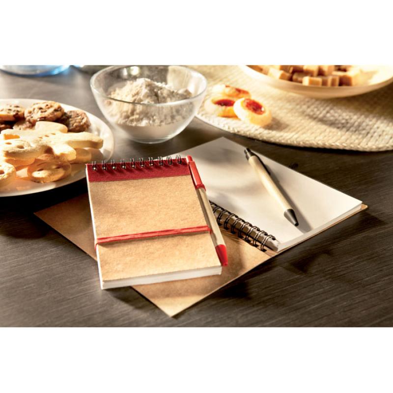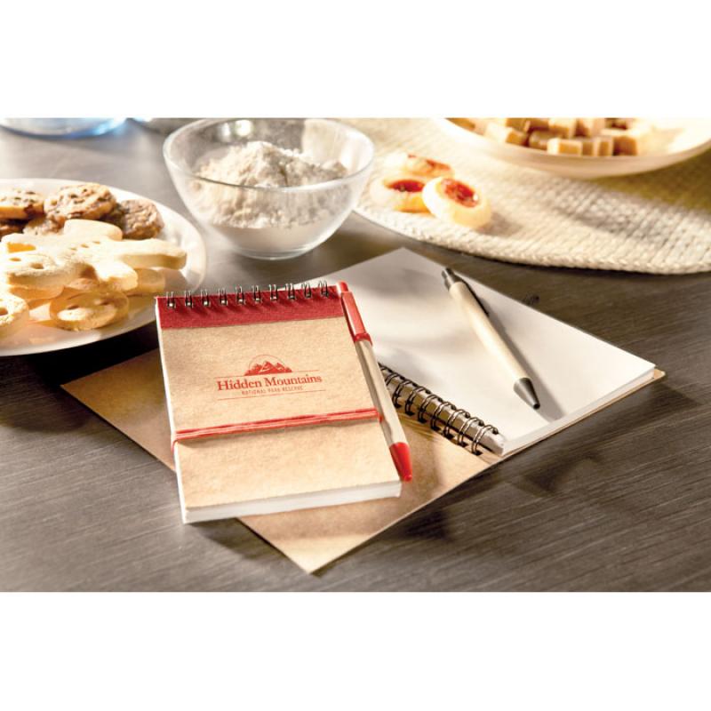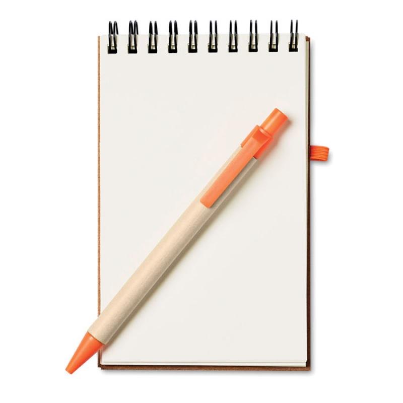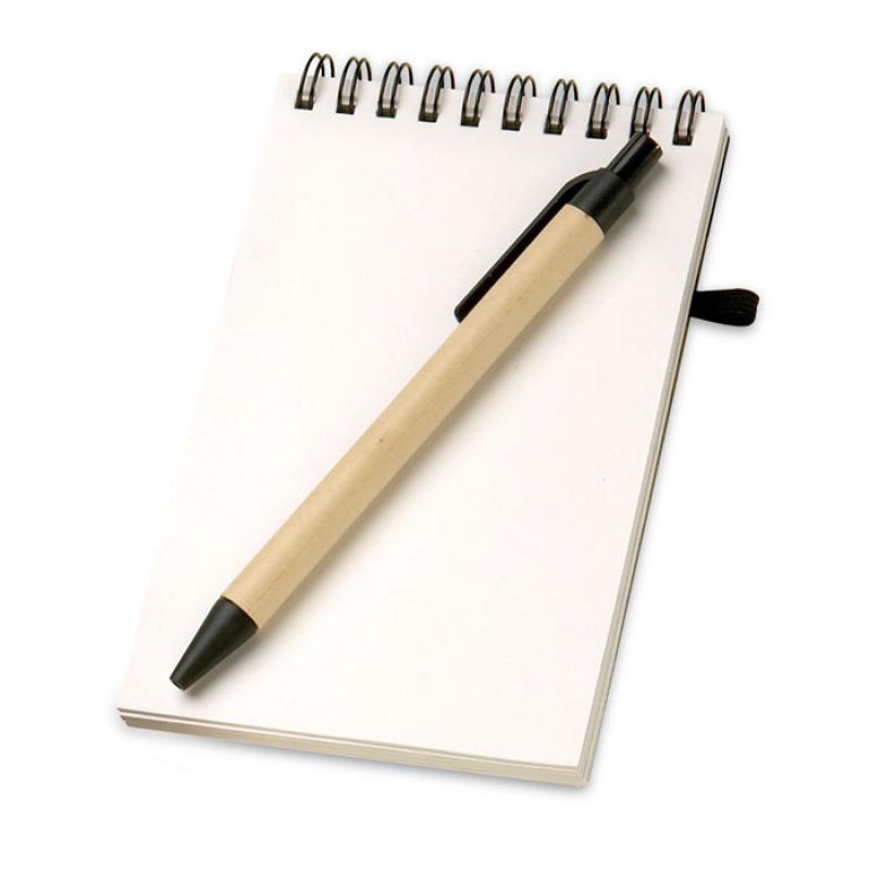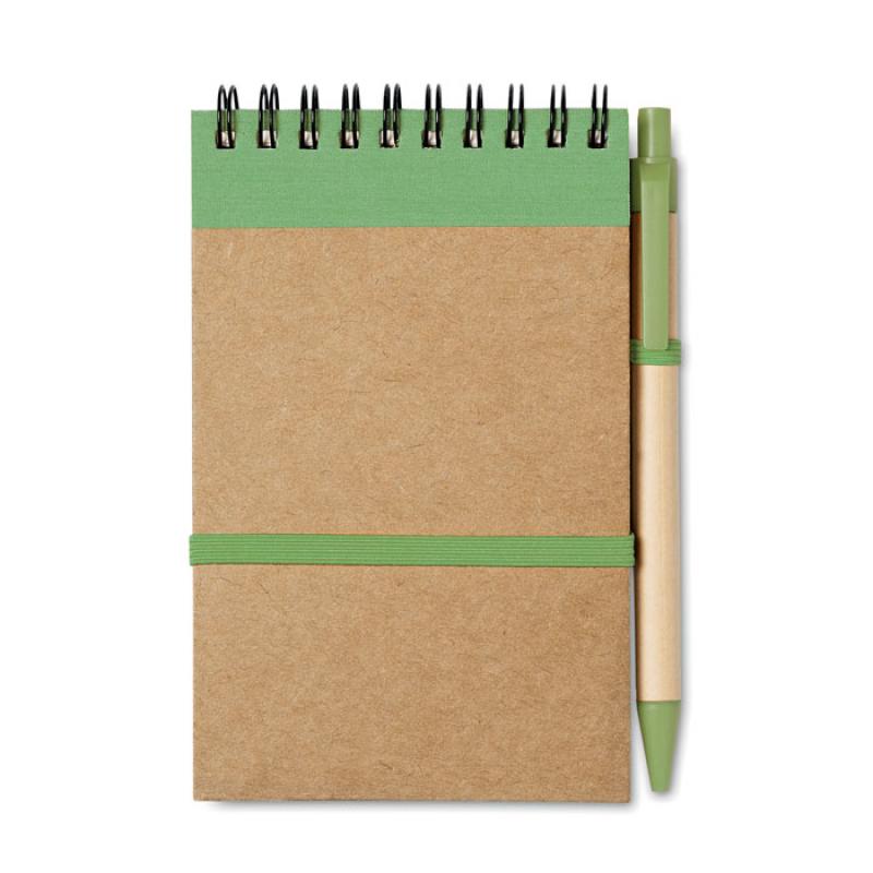 Libreta de bolsillo A6 con 70 hojas de papel reciclado. Incluye bolígrafo de tinta azul reciclado con piezas de plástico biodegradable