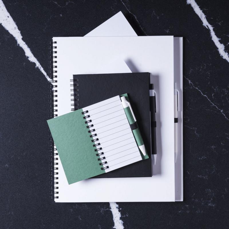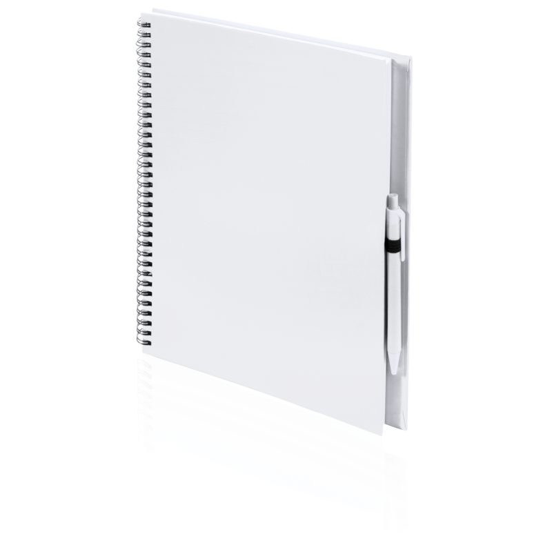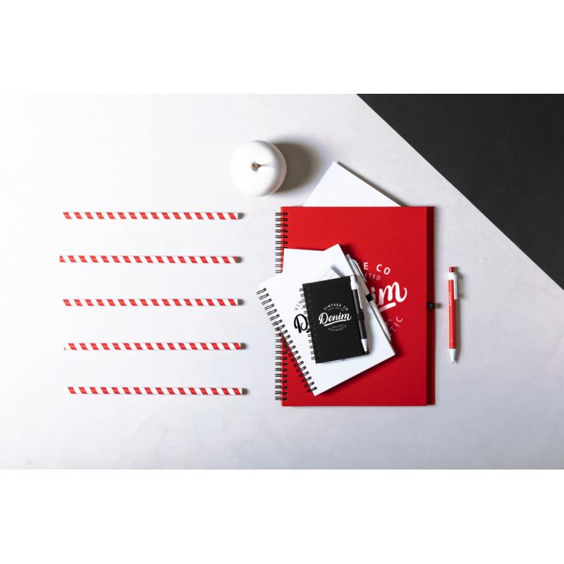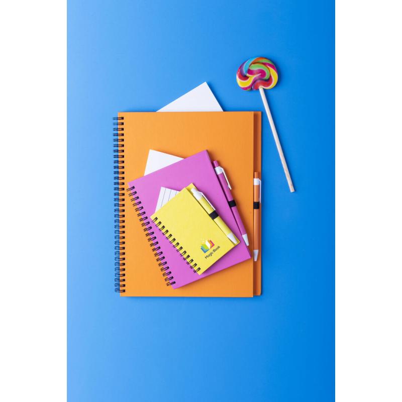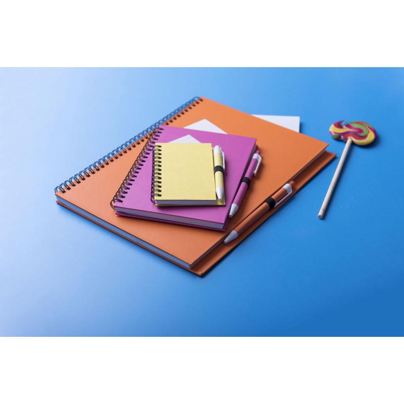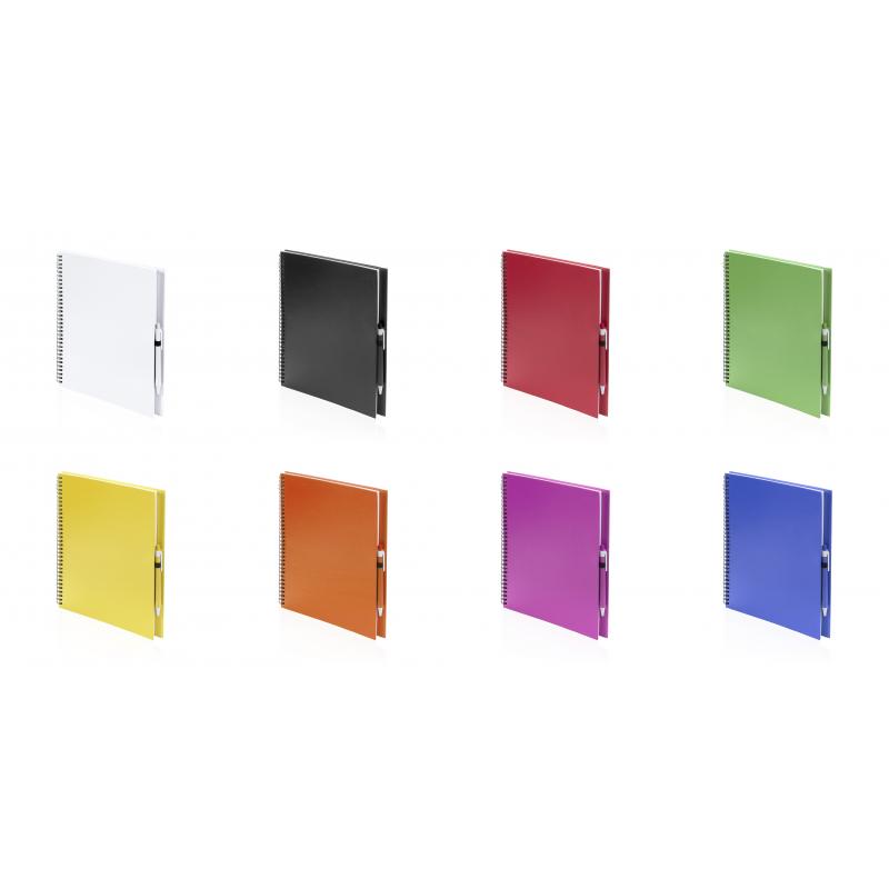 Libreta de anillas con tapas de suave tacto acabadas en resistente cartón reciclado y bolígrafo en cartón reciclado a juego. De atrevidos colores, 80 hojas lisas y con soporte para bolígrafo en contraportada.