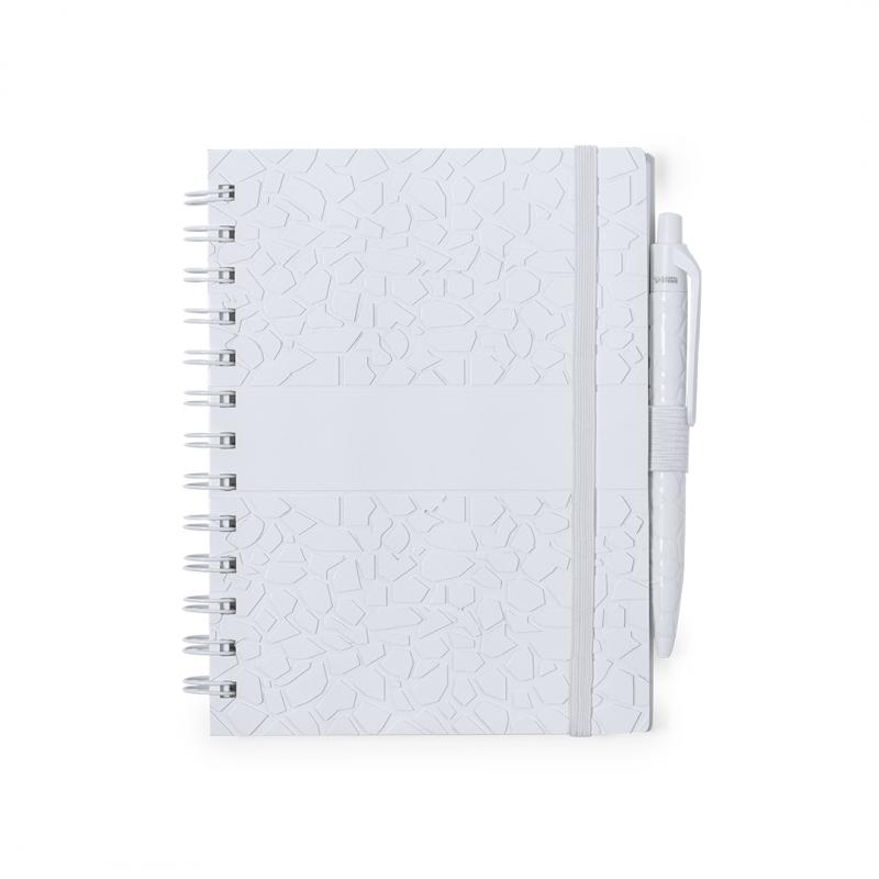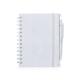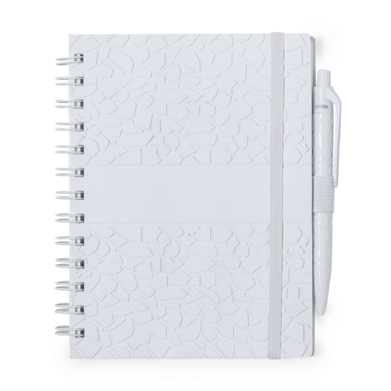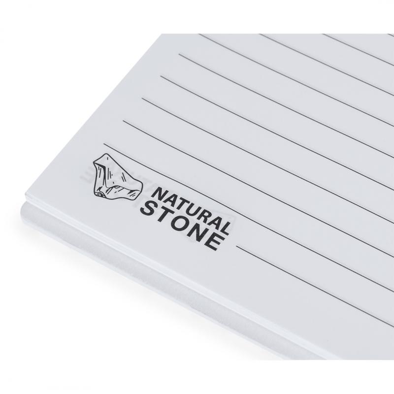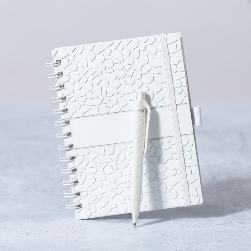 Set de libreta y bolígrafo. Contenido: Libreta de anillas con tapas rígidas fabricada a base de extractos de piedra en elegante acabado de color blanco y soporte para el bolígrafo. Portada de diseño único con relieve troquelado. De 70 hojas color blanco y disposición a una raya, con distintivo Natural Stone.Bolígrafo de línea nature y mecanismo pulsador. Cuerpo troquelado fabricado con extractos de piedra natural, ayudando a la reducción del uso de plásticos, además de proporcionar un acabado suave y resistente. En color blanco y con distintivo Natural Stone en la parte superior. De cartucho jumbo y en tinta azul.El material usado en la elaboración de la libreta es 100% reciclable y libre de cloro, con propiedades impermeables, altamente resistente y lavable, convirtiéndose así en una alternativa ecológica y sostenible frente al papel convencional, cuyo origen no es el tradicional ni proviene de los árboles.Presentado en bolsa individual reciclada