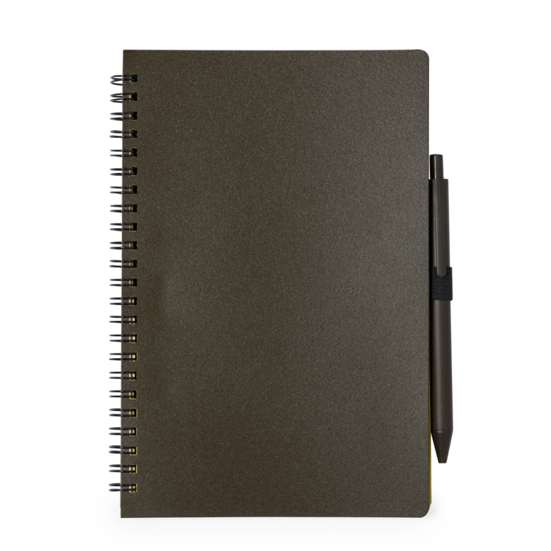 Set de libreta y bolígrafo. Libreta de anillas con tapas fabricadas en suave fibra de café y soporte para el bolígrafo. De 80 hojas con diseño eco y disposición a una raya. Bolígrafo de mecanismo pulsador, con cuerpo en fibra de café y tinta azul. Incluye distintivo fibra de café impreso en libreta y bolígrafo. Presentado en bolsa individual reciclada.La fibra de café se elaborada a partir de los residuos producidos en la obtención del café. Una alternativa sostenible que favorece la reducción del uso de plásticos, ahorrando energía en el proceso de fabricación y fomentando así el cuidado del medio ambiente.