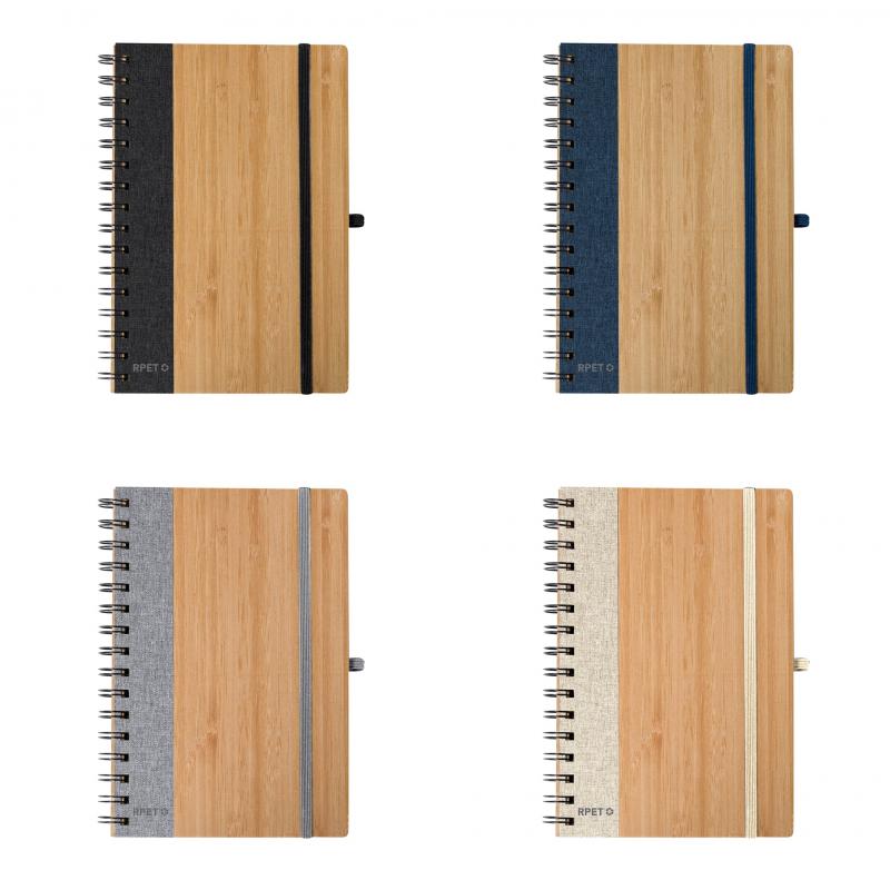 Libreta de anillas con tapas rígidas de bambú. Incluye 80 hojas con disposición a una raya de papel reciclado. Con cierre elástico, banda lateral, y soporte para bolígrafo a juego. Disponible en variada gama de colores, presentada individualmente en bolsa de papel reciclado. Materiales como el bambú fomentan la utilización de materias primas naturales, reduciendo las emisiones contaminantes. Proviene de una planta de gran resistencia y versatilidad, con crecimiento y regeneración rápidos, siendo una excelente alternativa al uso de madera tradicional.