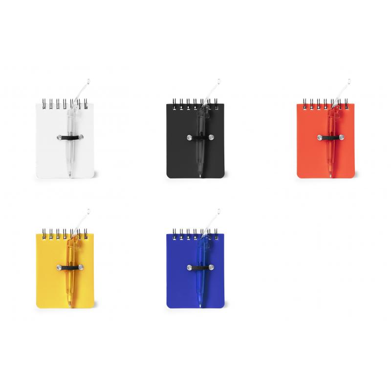 Minilibreta de anillas en divertidos colores con minibolígrafo en tapa a juego. De 60 hojas con distribución a una raya.