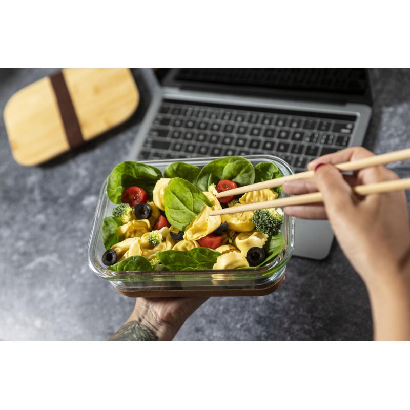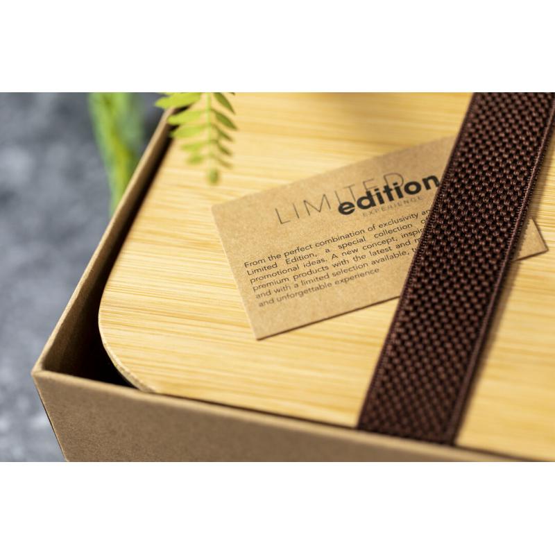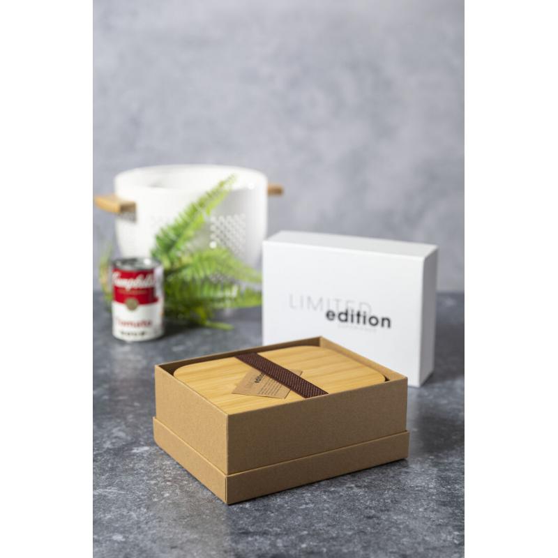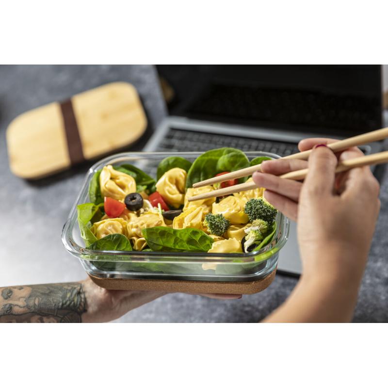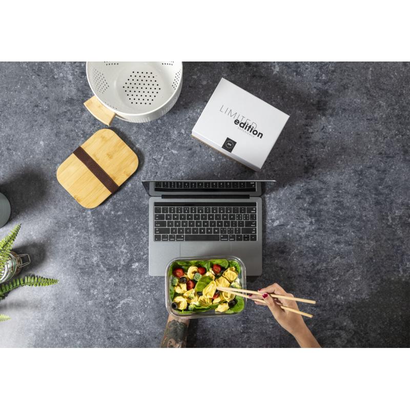 Fiambrera Limited Edition. Un fascinante diseño que conjuga diseño y sostenibilidad. Conformada por un compartimento principal en cristal de la más alta calidad de 730 ml litro de capacidad, tapa hermética en bambú y base en corcho natural. Incluye cinta de seguridad. De la perfecta combinación entre exclusividad y diseño, nace Limited Edition, una colección especial de ideas promocionales de edidición limitada. Un nuevo concepto, inspirado en la fusión de artículos premium con las últimas y más novedosas tendencias y que cuenta con una seleción limitada de unidades, convirtiendo así un regalo en una experiencia única e inolvidable. Exclusivo estuche de presentación Limited Edition, con diseño protegido por derechos de propiedad industrial. Incluida tarjeta con descripción de Limited Edition en cartón reciclado.
