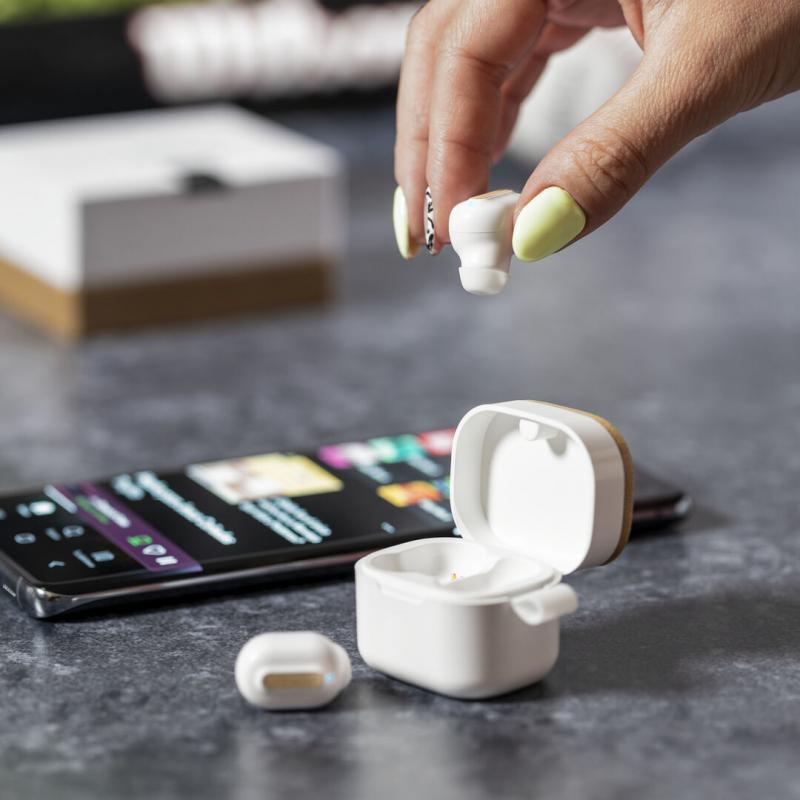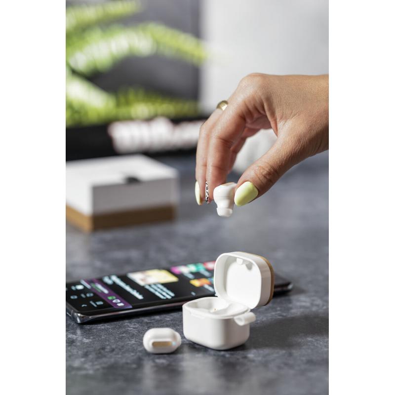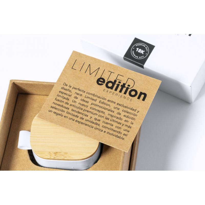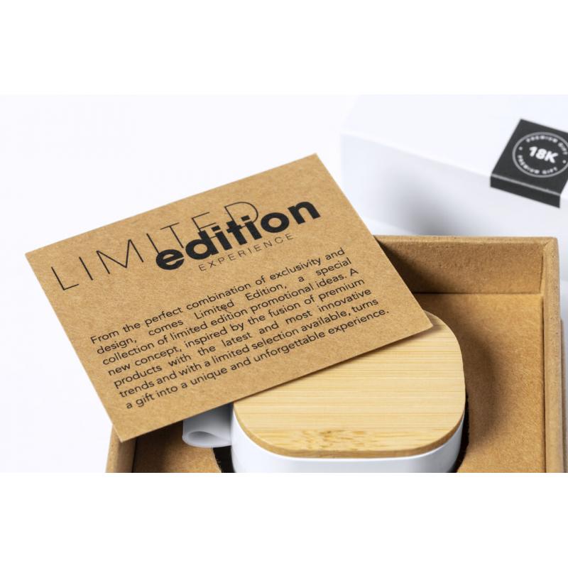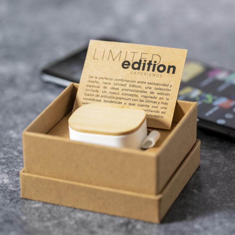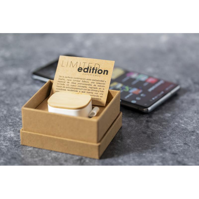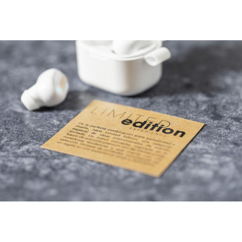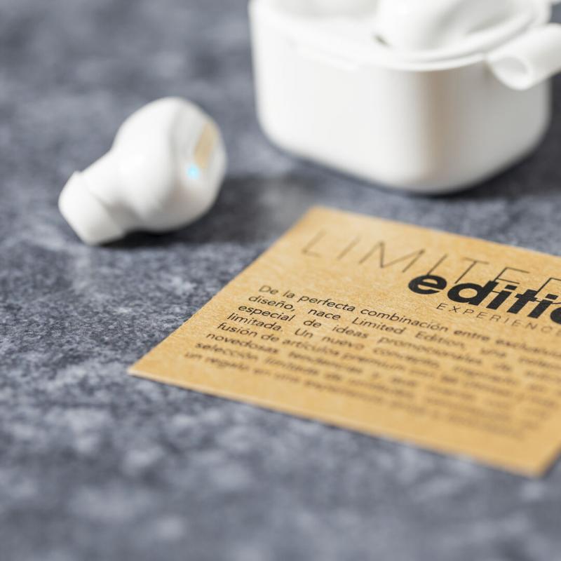Auriculares inalámbricos Limited Edition. Un rompedor diseño que conjuga diseño, funcionalidad, y sostenibilidad. En elegante acabado de color blanco en combinación con detalles en bambú natural y presentados en estuche cargador blanco con distinguida tapa de bambú. De diseño ergonómico, incluyen botón de control táctil integrado en el auricular, con base de carga a juego y luz LED indicadora de carga. Con conexión Bluetooth 5.0. Función manos libres y recargables con cable USB C incluido. Manual de instrucciones en Español e Inglés incluido. De la perfecta combinación entre exclusividad y diseño, nace Limited Edition, una colección especial de ideas promocionales de edidición limitada. Un nuevo concepto, inspirado en la fusión de artículos premium con las últimas y más novedosas tendencias y que cuenta con una seleción limitada de unidades, convirtiendo así un regalo en una experiencia única e inolvidable. Exclusivo estuche de presentación Limited Edition, con diseño protegido por derechos de propiedad industrial. Incluida tarjeta con descripción de Limited Edition en cartón reciclado.