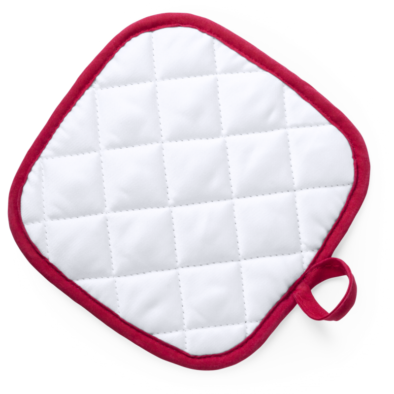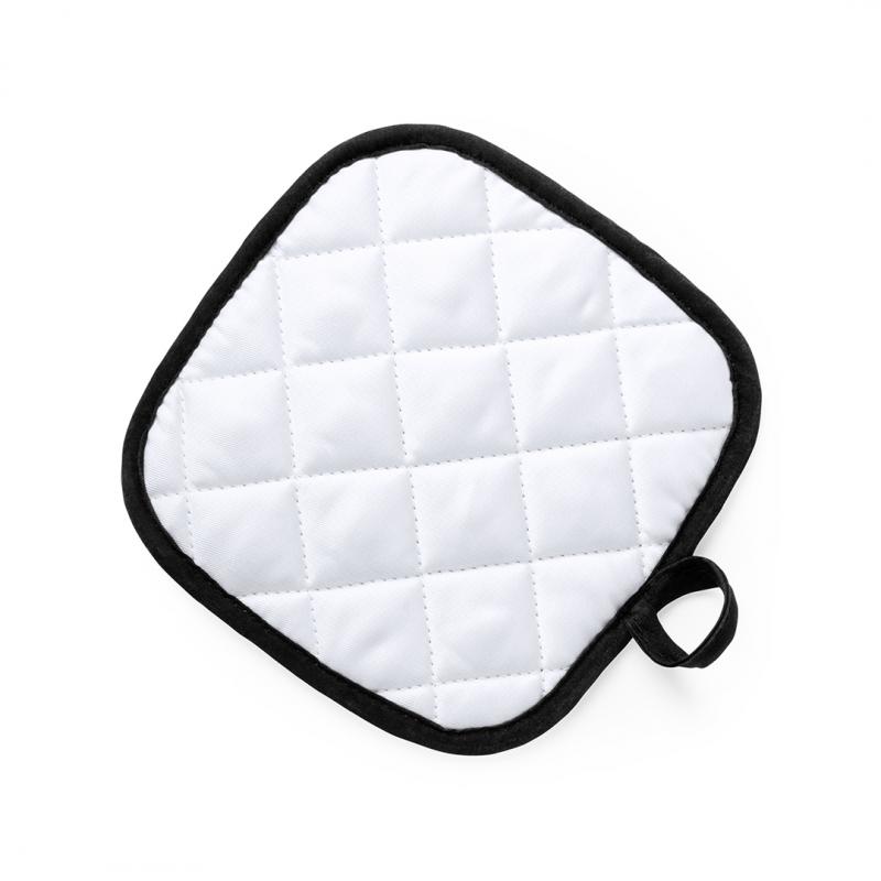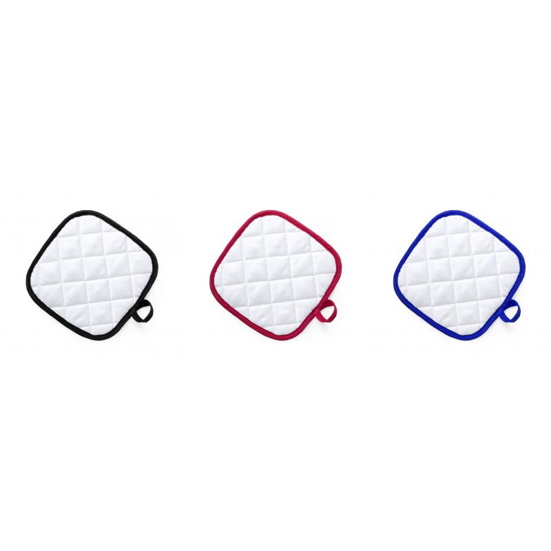 Agarrador de cocina en suave material 100% poliéster de suave acabado en color blanco y con bordes en vivos colores. Con una cara lisa especialmente diseñada para sublimación y cinta para colgar.