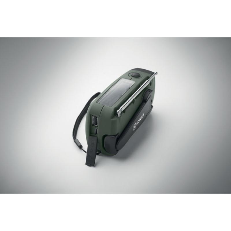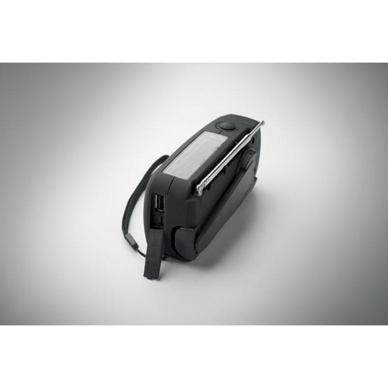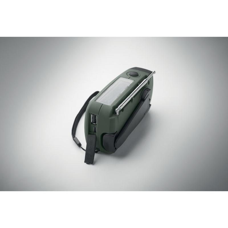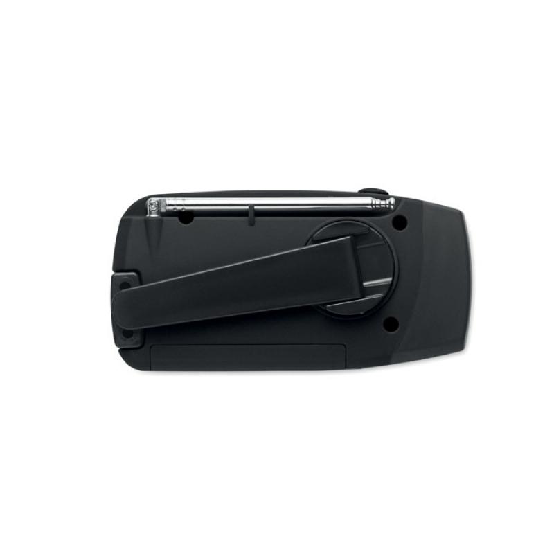 Radio AM/FM portátil en ABS con linterna LED (2 ajustes) y un power bank de 1200 mAh para carga de emergencia. Autoalimentado por energía solar y dinamo.Recipiente :