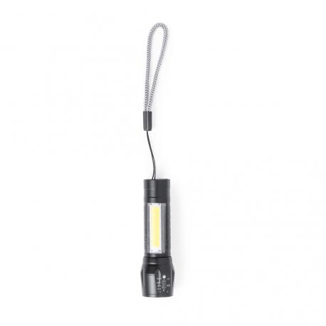 Potente linterna con batería recargable, fabricada en aluminio de acabado en color negro. Luz frontal con 1 LED y cabezal regulable, para tener un enfoque más focalizado o abierto. Además, cuenta con 10 luces COB en el mango y tres modos de iluminación (fija e intermitente de dos velocidades), incluye cinta de trasporte. Se alimenta mediante una batería recargable de 400 mAh, incluido cable micro USB. Presentada individualmente en caja de diseño.