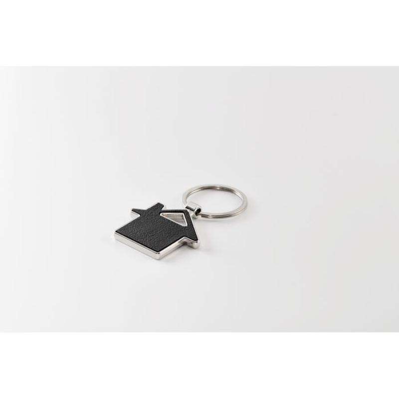 Llavero metálico en forma de casa con incrustación de cuero sintético reciclado.Recipiente :