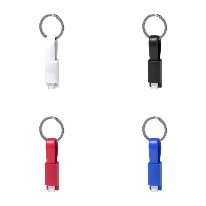 Cargador llavero USB en variada gama de vivos colores. Con conexión dual micro USB/lightning. Presentado en bolsa individual.