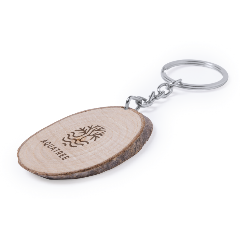 Elegante llavero de línea nature. Piezas obtenidas al corte de madera de haya, por lo que su textura, color y grosor pueden variar, convirtiéndolo así en una pieza única.Con amplia superficie de marcaje y disponible en diseños ovalado y redondeado.