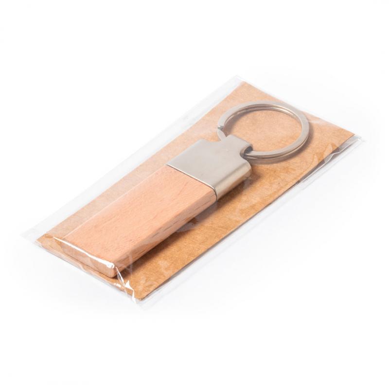 Llavero en combinación de materiales metal de acabado brillante y madera de haya barnizada. Con amplia superficie para marcaje y presentado en bolsa individual con tarjeta kraft.