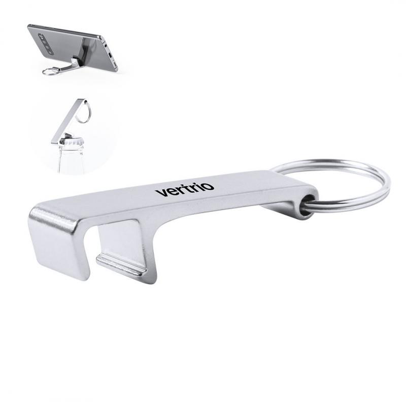 Llavero soporte para smartphone y tablet fabricado en aluminio de acabado mate, especialmente diseñado para marcaje en láser. Presentación individual en bolsita autocierre.