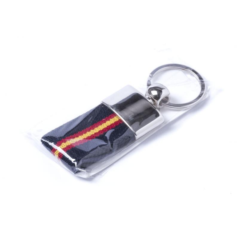 Llavero de poliéster con accesorios de bandera española en la cinta y refuerzo metálico en acabado plateado brillante.