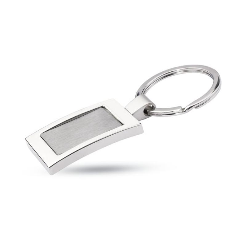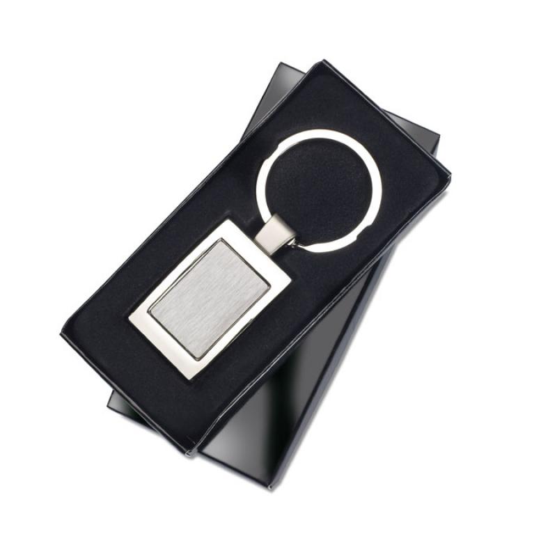 Lujoso llavero rectangular de aleación de zinc cromado. Presentado en caja de regalo individual.