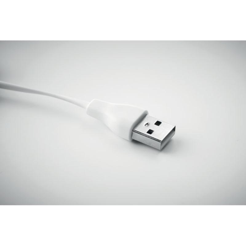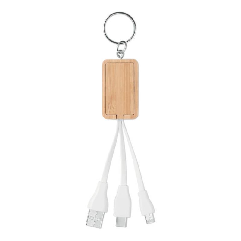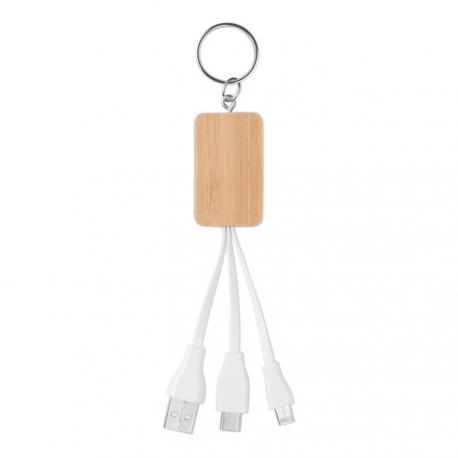 Llavero con carcasa de bambú con cable USB-A a micro-B (2 en 1) y tipo C. El bambú es un material natural, el color del articulo, la medida y la impresión sobre el puede variar.