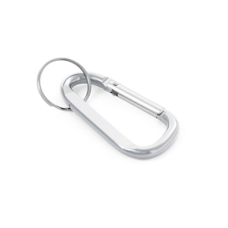 Mosquetón de aluminio con argolla para llavero y área plana para la personalización. No apto para la práctica de escaladaRecipiente :