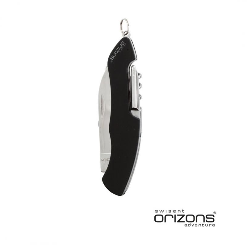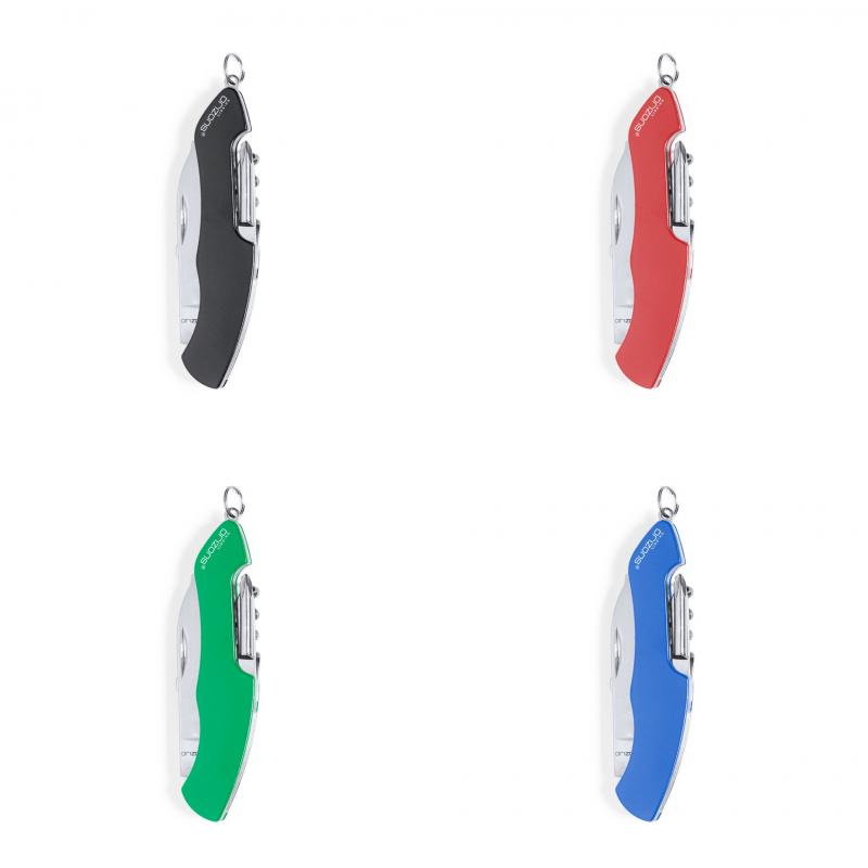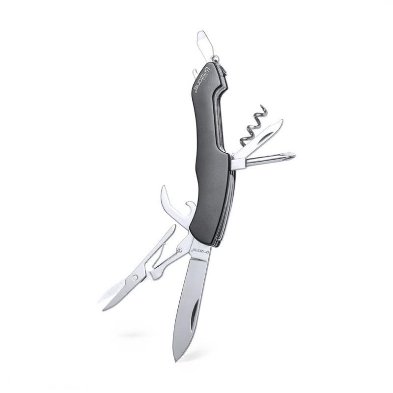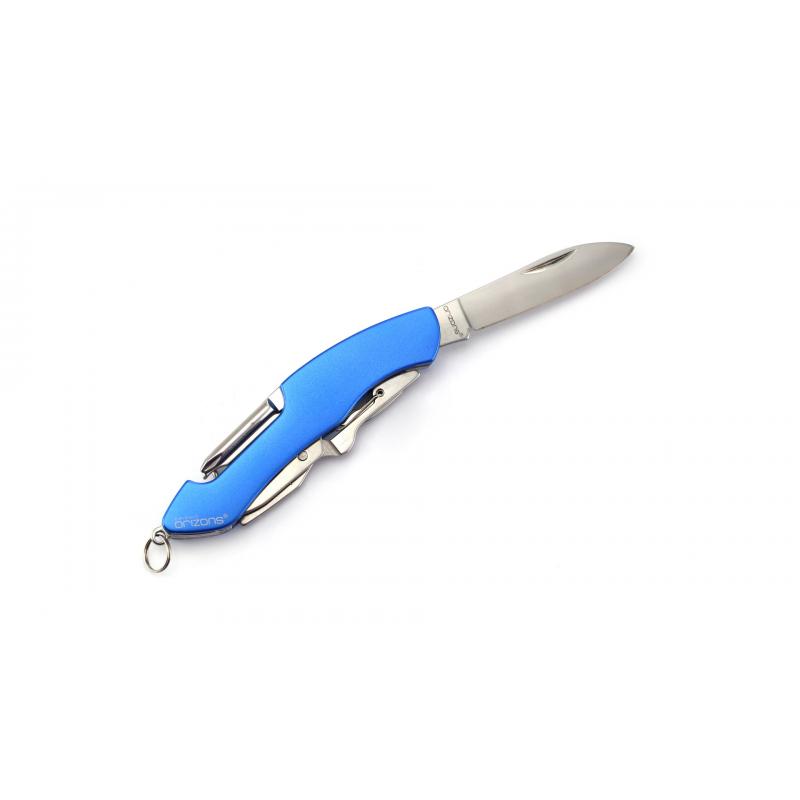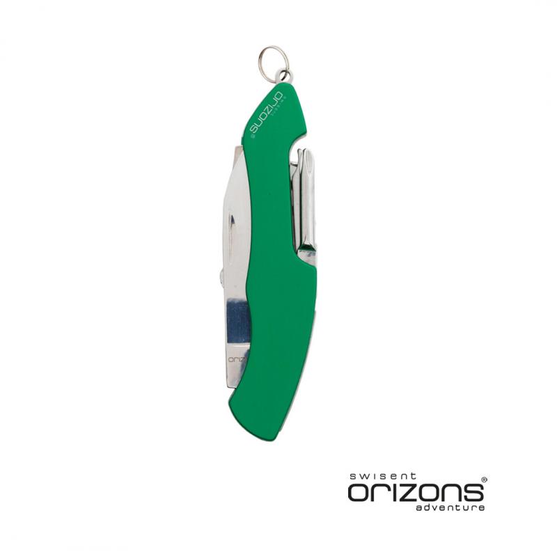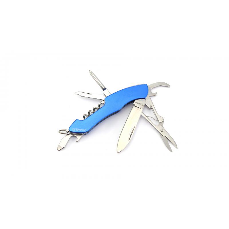 Navaja multiusos de orizons con accesorios de acero inox de 10 funciones y mango de aluminio en vivos colores. Con navaja, tijeras, abrelatas, abrebotellas con destornillador plano, destornillador de punta de estrella, punzón con lima y sacacorchos. Con anilla para llavero y presentada en atractiva caja de diseño con logotipo de la marca.