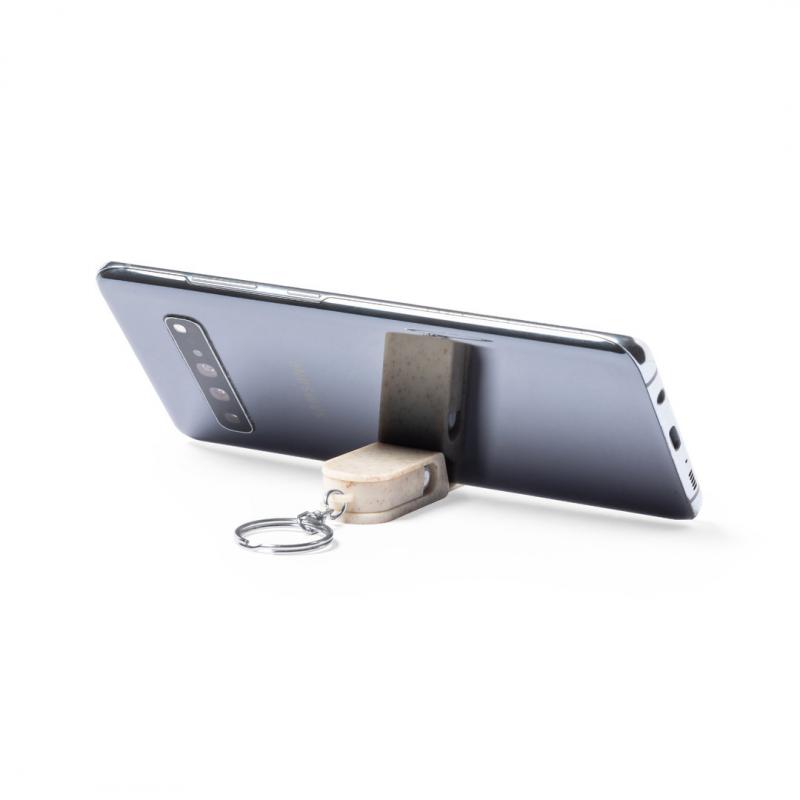 Llavero soporte para smartphone de línea nature, fabricado en caña de trigo. Con mecanismo giratorio y accesorio limpiapantallas incluido. Anilla metálica cromada.La caña de trigo fomenta la utilización de materias primas naturales, reduciendo así las emisiones contaminantes.