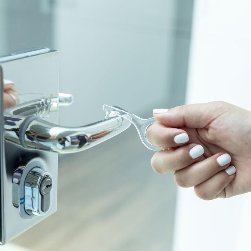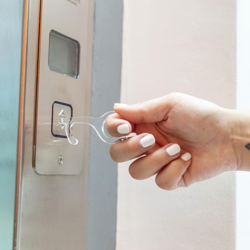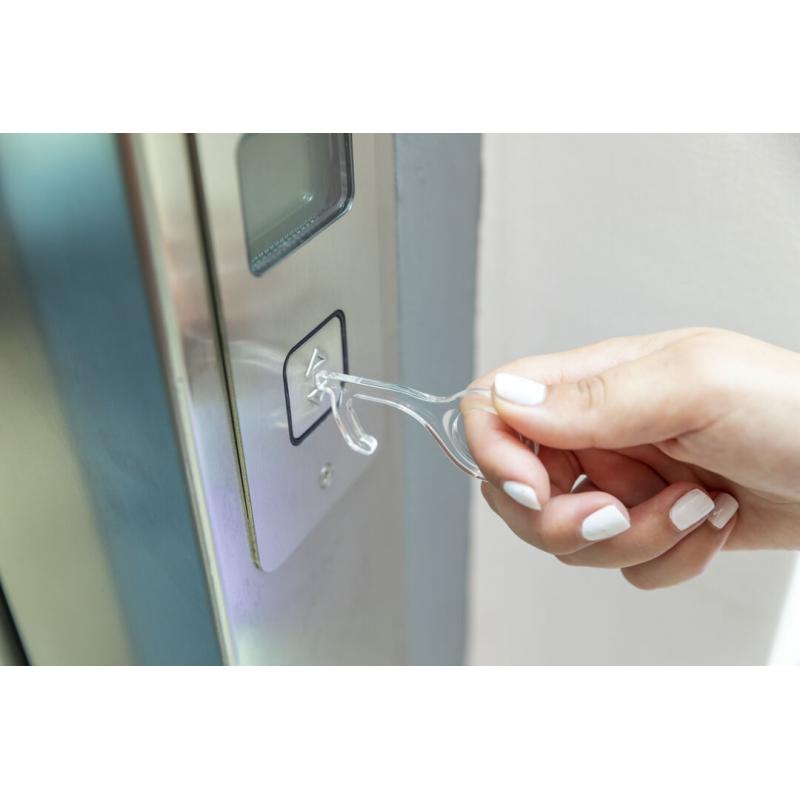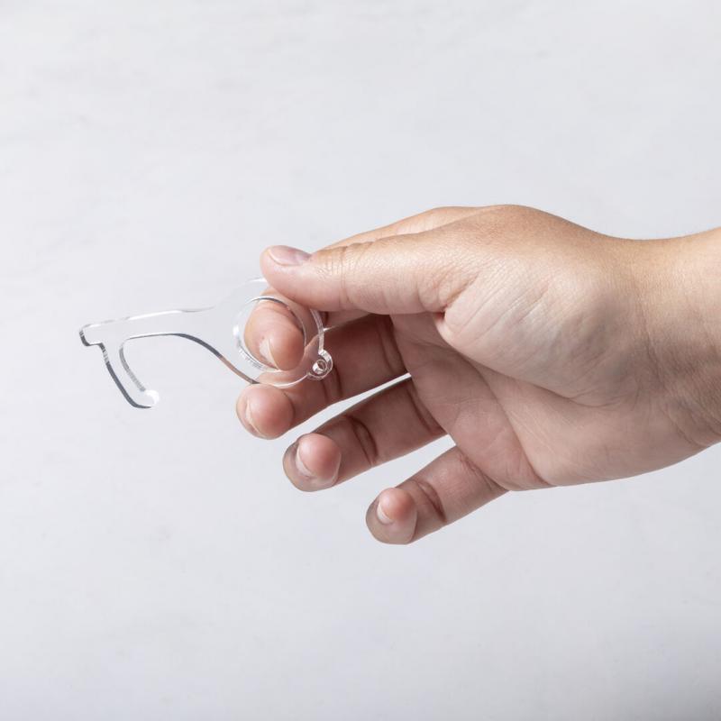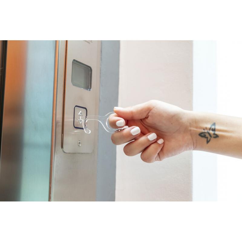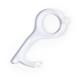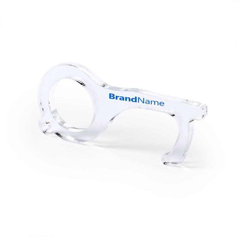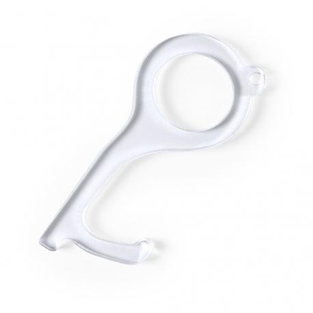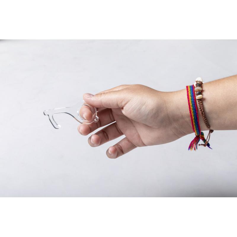 Llavero higiénico anti-contacto, fabricado en original y resistente material acrílico de acabado transparente. Especialmente diseñado para evitar tocar con las manos superficies de uso común (manivelas de puertas, interruptores, grifos de uso público, cajeros automáticos...). Con cómodo troquel para el dedo y presentado en bolsa individual de diseño. Recomendado para marcaje en tampografía.