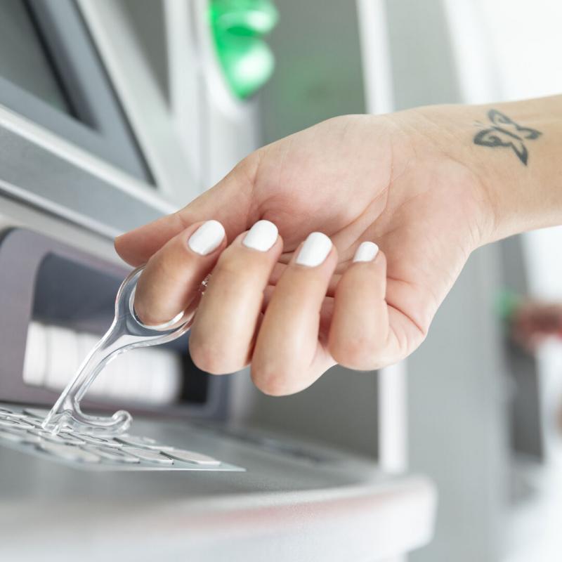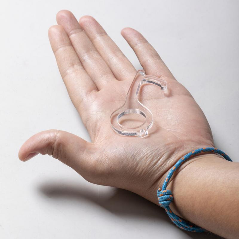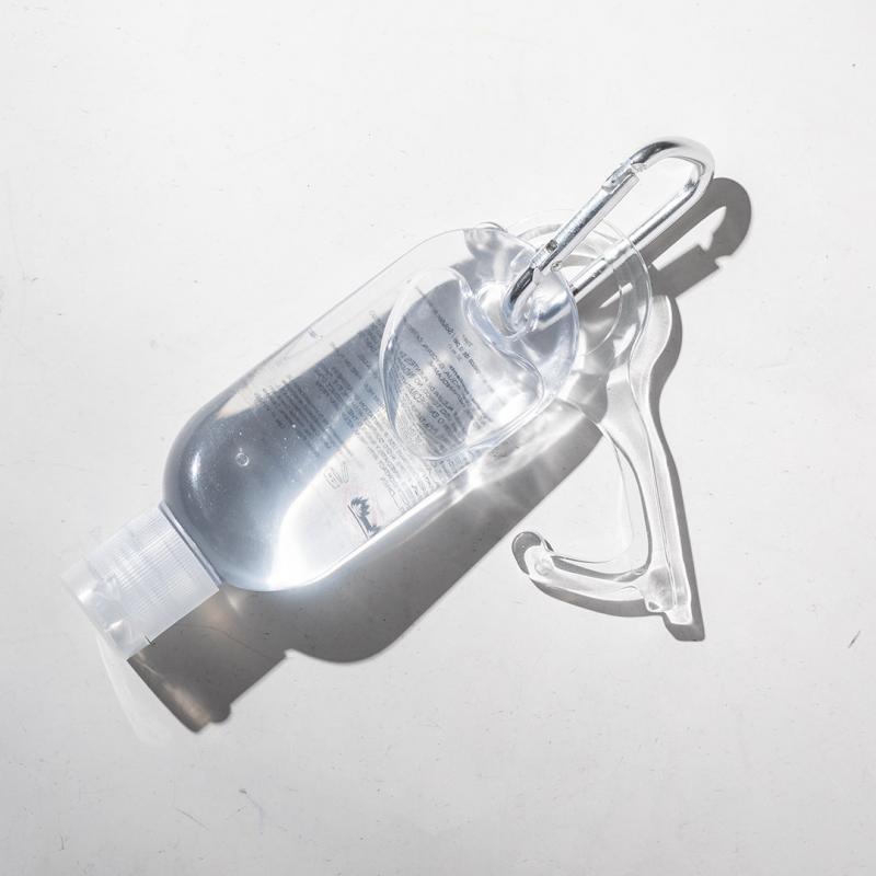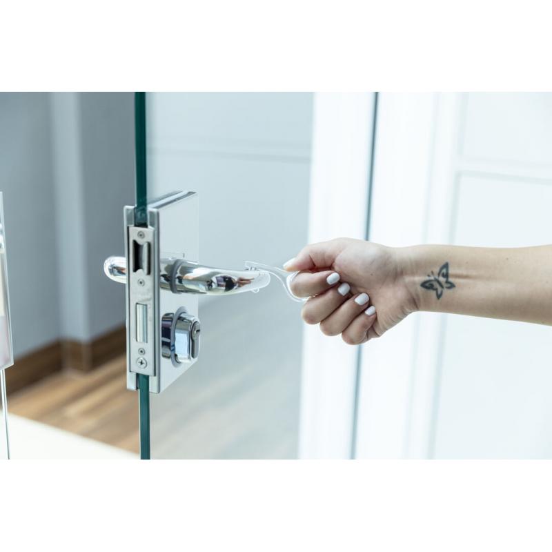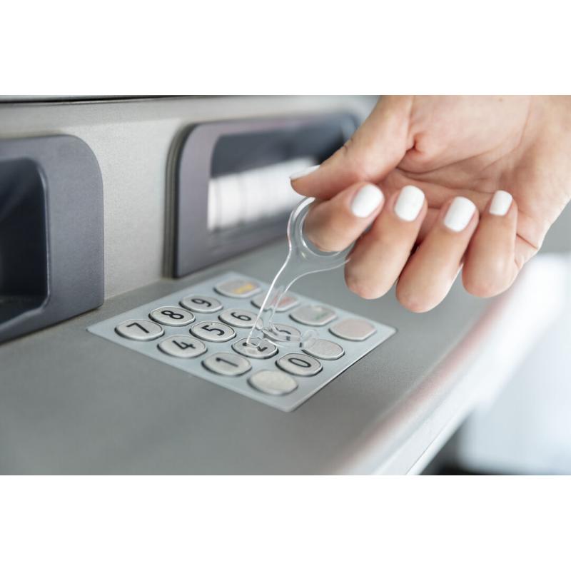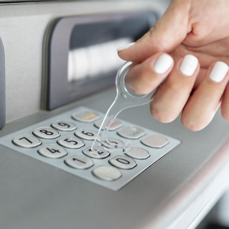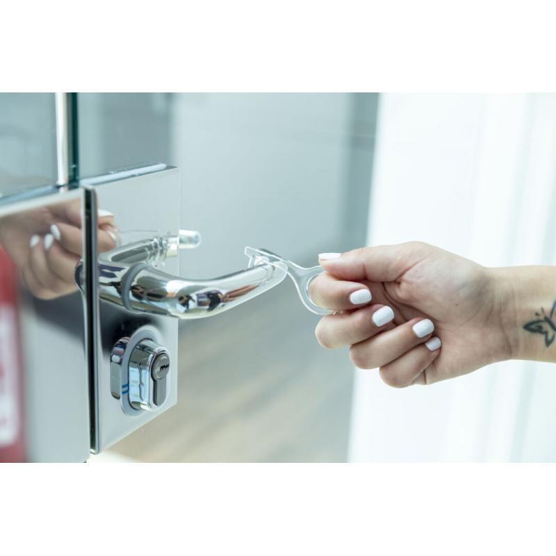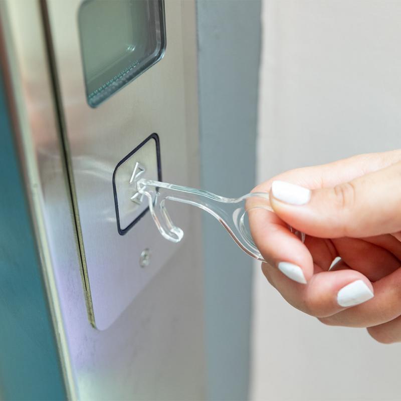 Llavero higiénico anti-contacto, fabricado en original y resistente material acrílico de acabado transparente. Especialmente diseñado para evitar tocar con las manos superficies de uso común (manivelas de puertas, interruptores, grifos de uso público, cajeros automáticos...). Con cómodo troquel para el dedo y presentado en bolsa individual de diseño. Recomendado para marcaje en tampografía.