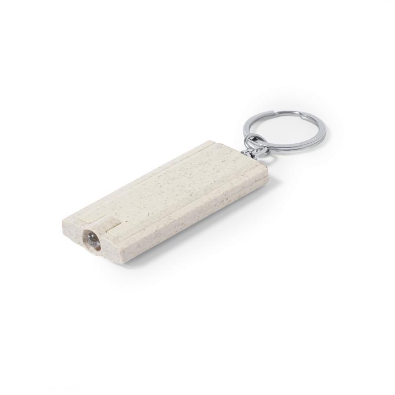 Llavero linterna de fabricado en caña de trigo y ABS.1 LED, con alimentación a pilas (de botón incluidas). Distintivo Wheat Straw y presentado en bolsa individual reciclada.Elaborado con elementos vegetales para así fomentar la utilización de materias primas naturales y reducir las emisiones contaminantes.