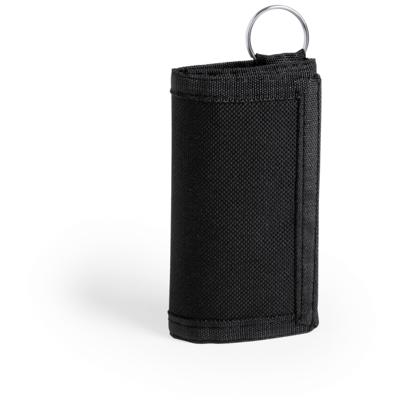 Llavero monedero en resistente poliéster 600D de vivos colores y cierre de velcro. Interior con monedero de cierre de cremallera, compartimento para tarjeta y anilla llavero.
