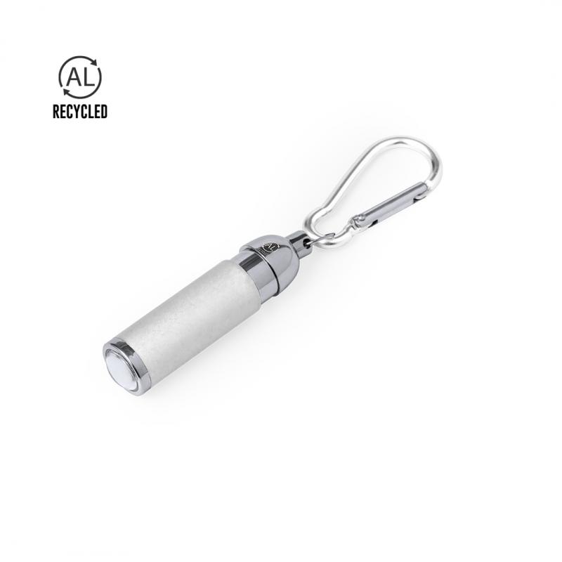 Llavero linterna con cuerpo fabricado en Aluminio Reciclado. Equipado con 1 LED de potencia, funciona con pilas de botón incluidas y cuenta con un enganche en forma de mosquetón del mismo color. Incluye logotipo Aluminio Reciclado en un lateral y está disponible en una variada gama de colores. Presentado en caja de diseño kraft.El Aluminio Reciclado es un material con posibilidades de reciclaje casi infinitas, sin perder sus propiedades originales y consumiendo menos energía en este proceso.Certificación GRS (Global Recycled Standard / Estándar de Reciclaje Global), que garantiza el origen reciclado del material usado para fabricar el producto.