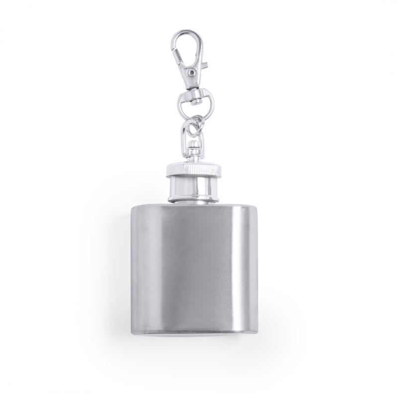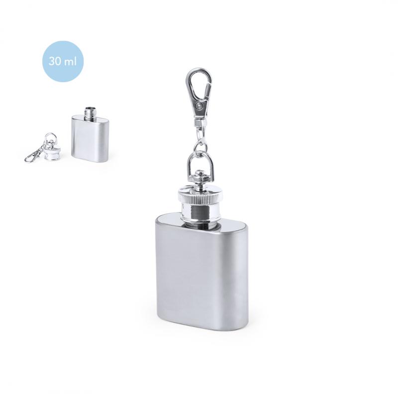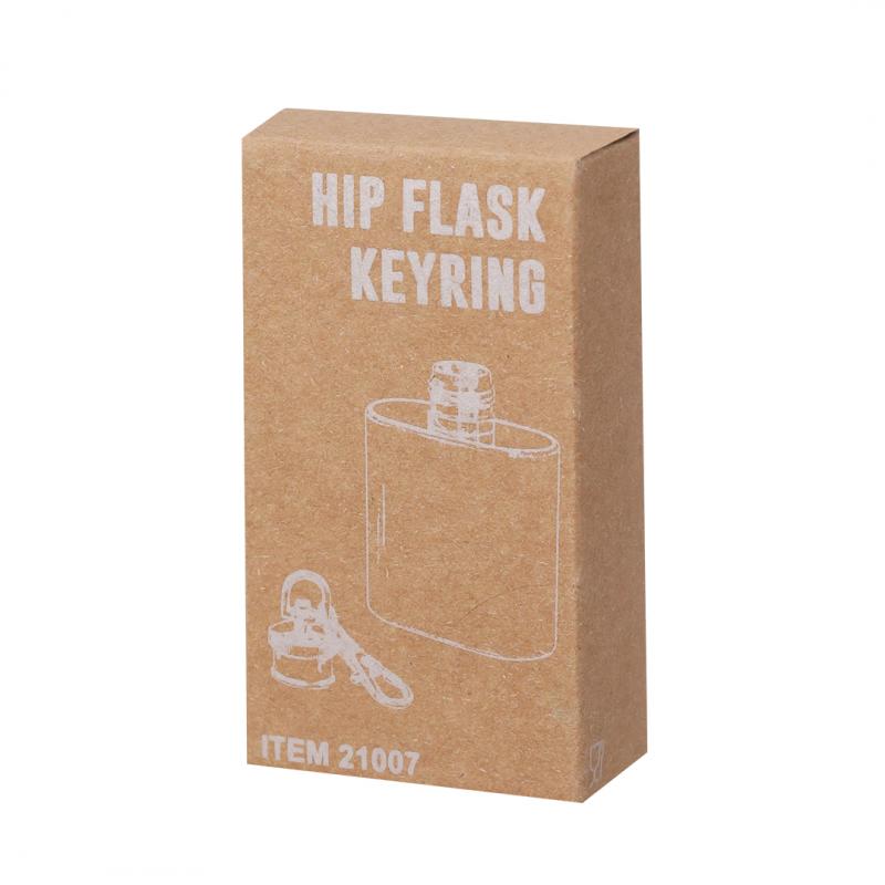 Práctico llavero petaca fabricado en acero inox, de 30 ml de capacidad. Tapón con cierre de seguridad a rosca y mosquetón giratorio. Presentado en caja de diseño kraft.