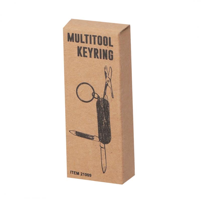 Práctico llavero multiherramienta, con accesorios fabricados en resistente acero inox y carcasa en madera natural. Con 3 funciones: tijeras, cuchillo y lima. Presentado en caja individual de diseño kraft.