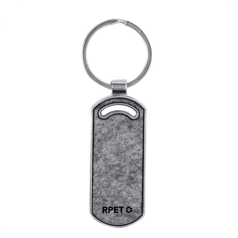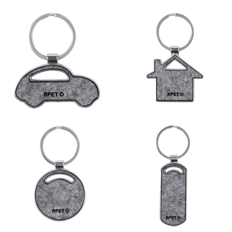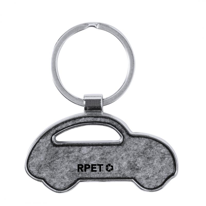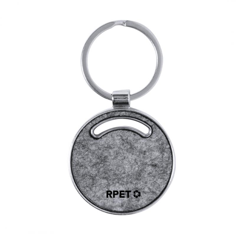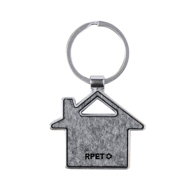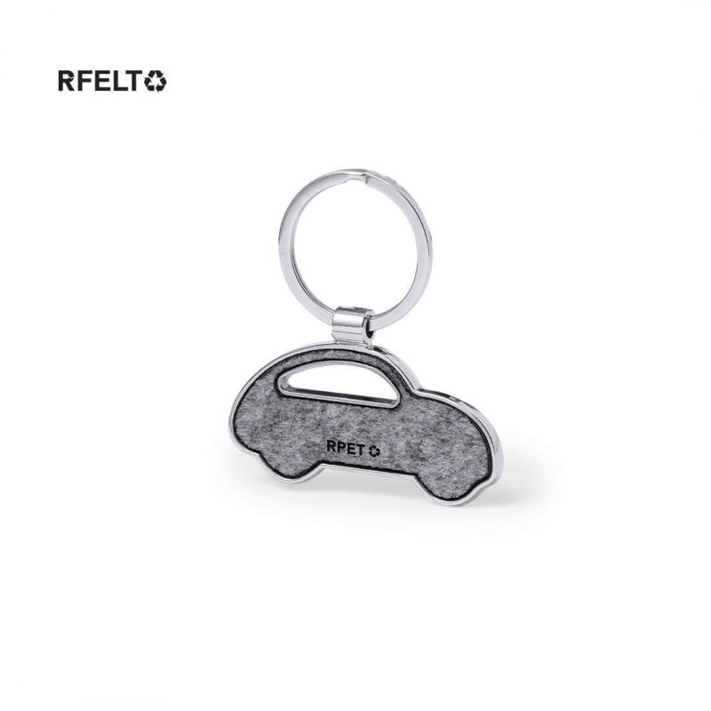 Llavero fabricado en combinación de base metálica y caras en fieltro RPET. Disponible en diseño circular; en diseño rectangular con bordes redondeados; y en formas de casa, y coche. Con amplia superficie de marcaje y logotipo RPET en el frontal. Presentado en una bolsa individual de papel reciclado. El fieltro RPET es fruto de la combinación del proceso de reciclaje de materiales plásticos junto con la técnica milenaria de fabricación del fieltro, dando como resultado un material de eco-tendencia que, además de ser de origen reciclado, también se convierte en reciclable.