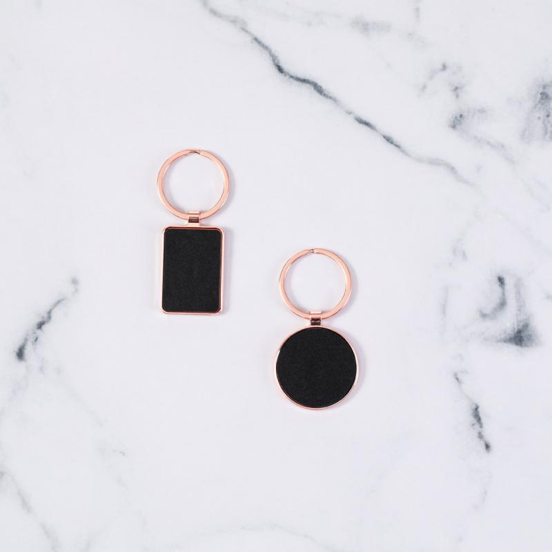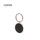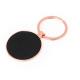 Llavero metálico de sofisticado diseño, con recubrimiento de cobre galvanizado y acabado brillo. Forrado en elegante polipiel en una de sus caras y disponible en diseño rectangular y circular. Presentado individualmente bolsa de papel reciclado.