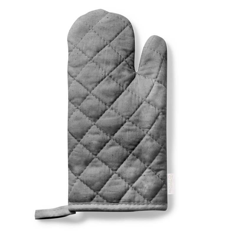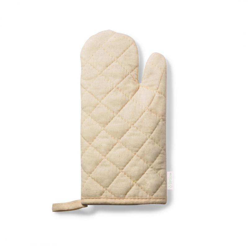 Manopla de cocina de línea nature. Fabricada en material 100% algodón reciclado de alta calidad. Con una cara lisa para impresión y cinta para colgar. Distintivo algodón reciclado en etiqueta.