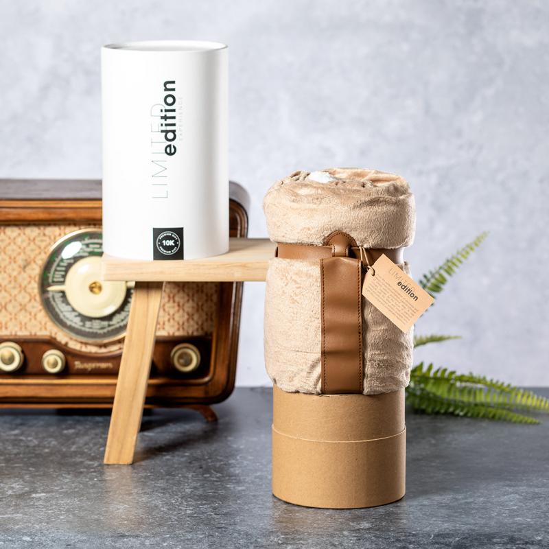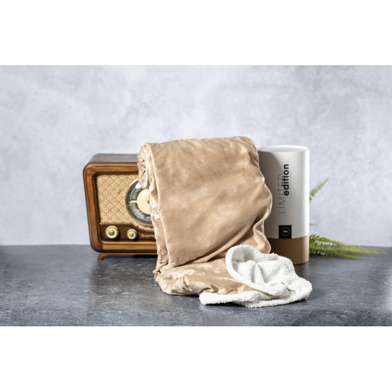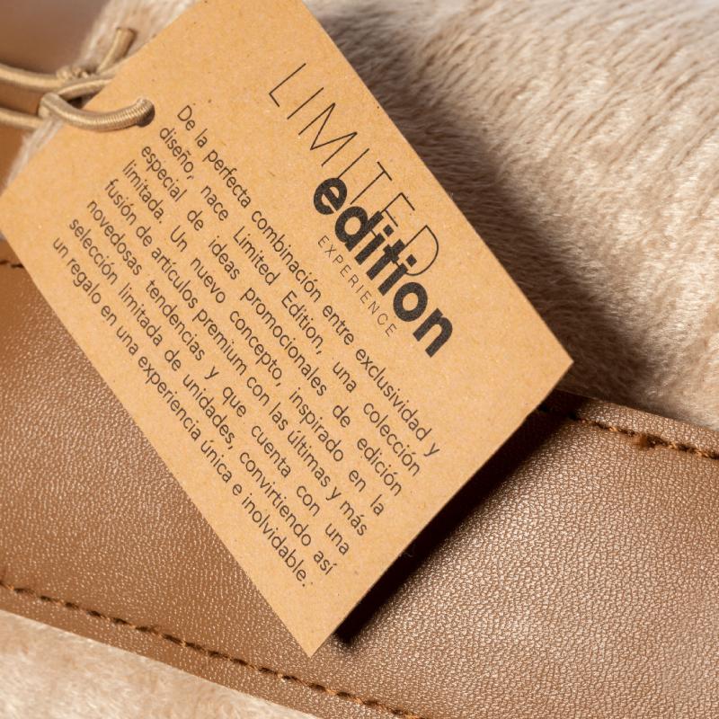 Manta de diseño exclusivo Limited Edition. En elegante diseño bicolor, con exterior en coral fleece tono camel e interior en suave borreguillo de color blanco. Fabricada en materiales premium (Coral Fleece y Sherpa 380g/m2), con cinta de transporte en polipiel de tono marrón.Presentación en estuche Limited Edition Experience, de diseño único y protegido por derechos de propiedad industrial. Incluida tarjeta en cartón reciclado con descripción Limited Edition.De la perfecta combinación entre exclusividad y diseño nace Limited Edition, una colección especial de ideas promocionales de edición limitada. Un nuevo concepto, inspirado en la fusión de artículos premium con las últimas tendencias, en tiradas de unidades limitadas, y ofreciendo una experiencia de regalo única, exclusiva e inolvidable.