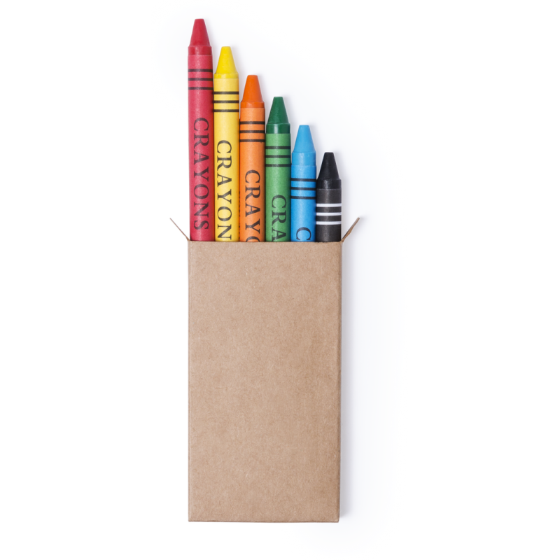 Set de 6 ceras en caja de cartón natural. Con cuerpo cilíndrico en variados colores. En colores rojo, verde, amarillo, azul, marrón, y naranja.