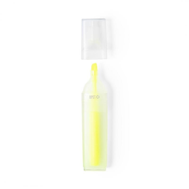 Marcador fluorescente de línea nature fabricado en RPET, elaborado a partir de plástico reciclado para así fomentar la reutilización de residuos plásticos y ayudar a la sostenibilidad del planeta. Con cuerpo transparente y capucha a juego. Con distintivo RPET impreso en el marcador.