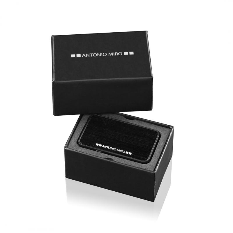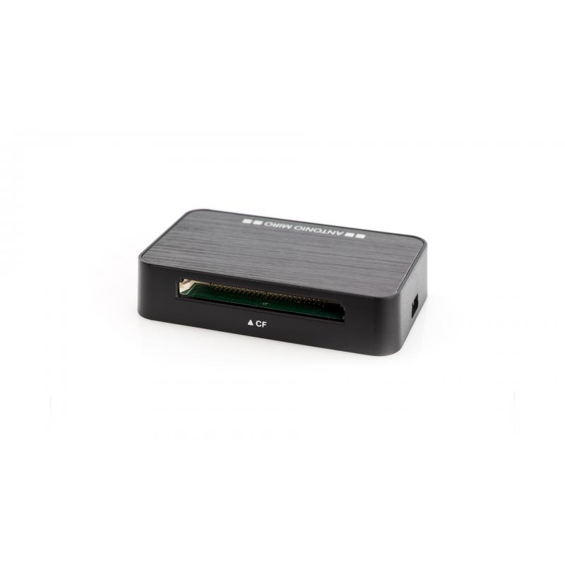 Lector de tarjetas de Antonio Miró con parte superior acabada en aluminio de elegante color negro. Compatible con tarjetas MS, M2, TF, XD, SD y CF. Presentado en caja individual con logotipo de la marca e interior troquelado en suave espuma.