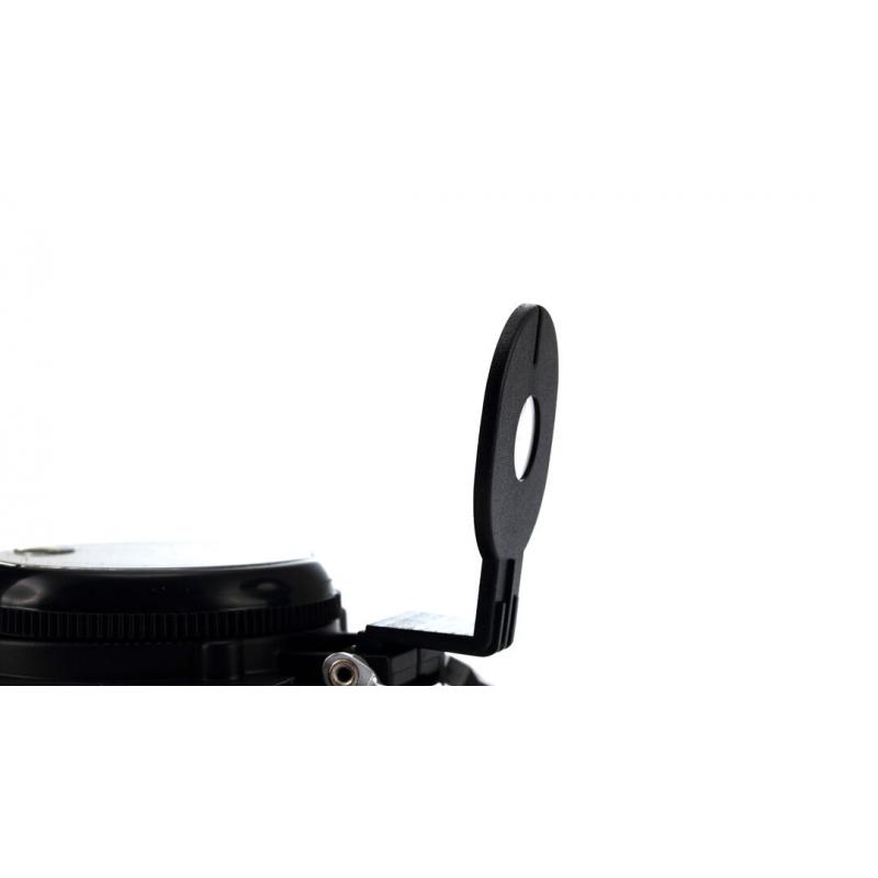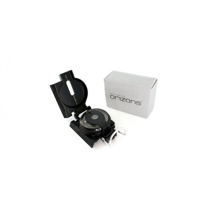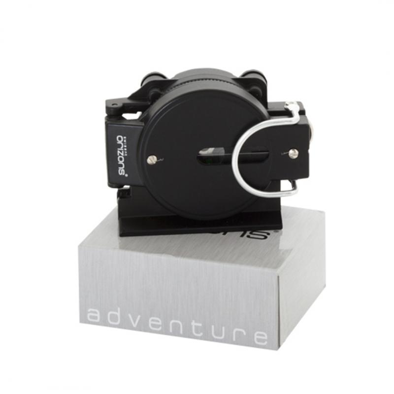 Brújula de Orizons de alta precisión con cuerpo en resistente aluminio, accesorio de fijación y presentada en atractiva caja de diseño con logotipo de la marca.