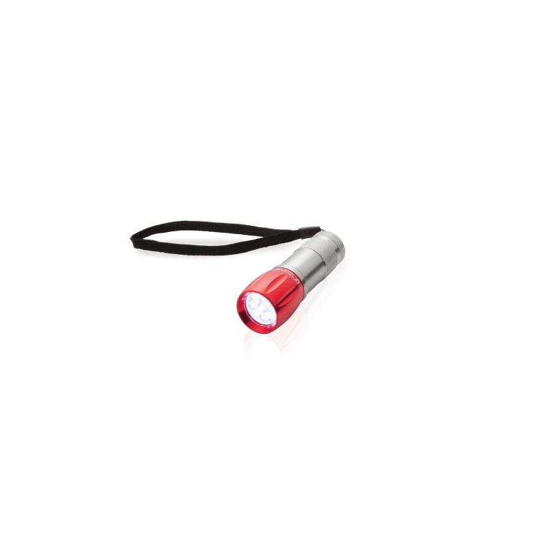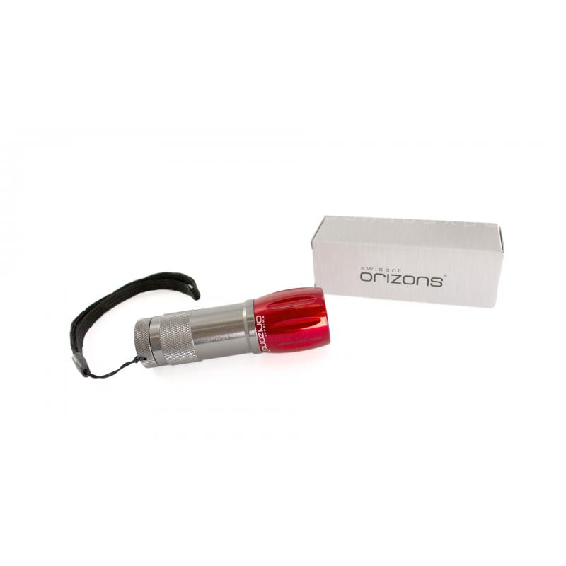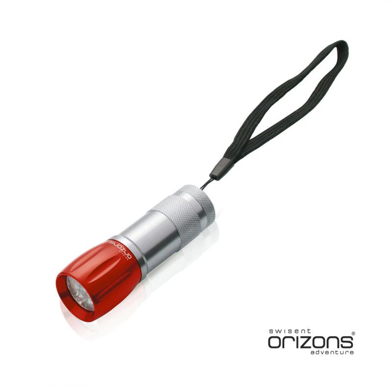 Linterna de Orizons de 9 ledes de alto poder de iluminación. Con resistente cuerpo en aluminio de diseño bicolor con mango antideslizante, pulsador protegido con recubrimiento de resistente goma y cinta de transporte. Alimentación a pilas: 3xAAA no incluidas. Presentada en atractiva caja de diseño con logotipo de la marca.