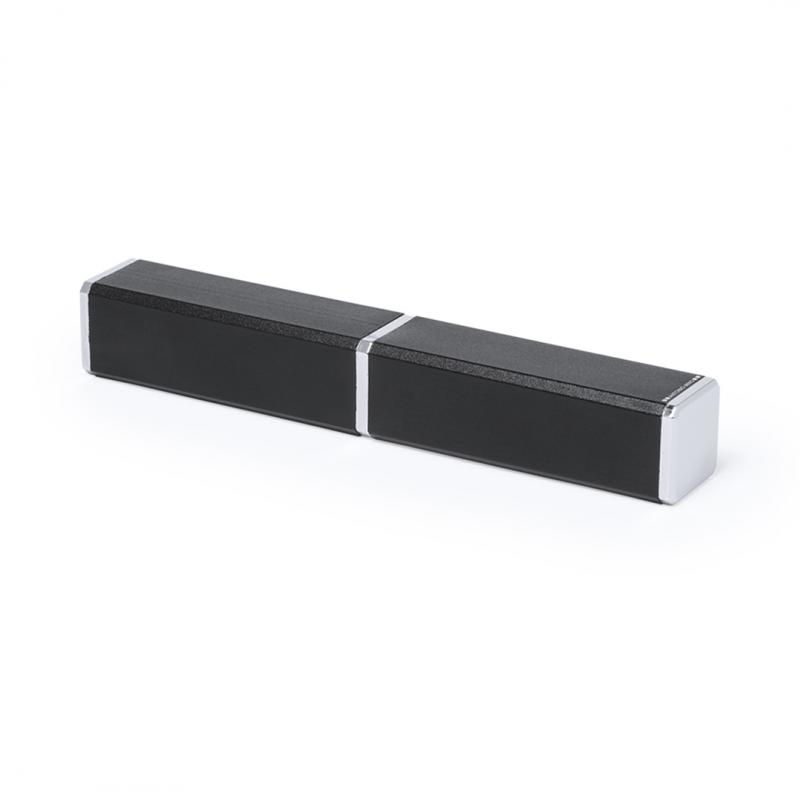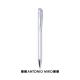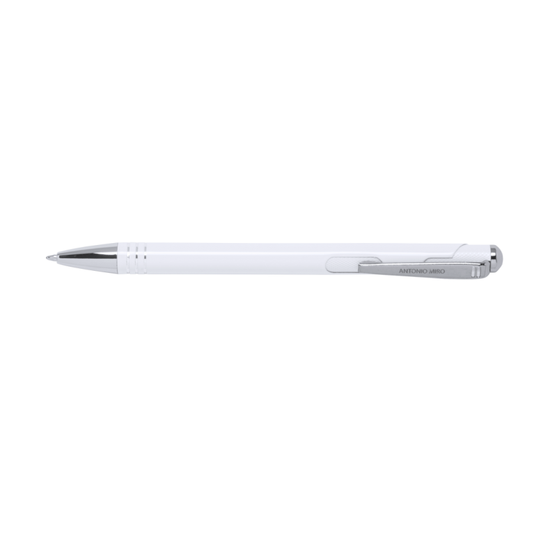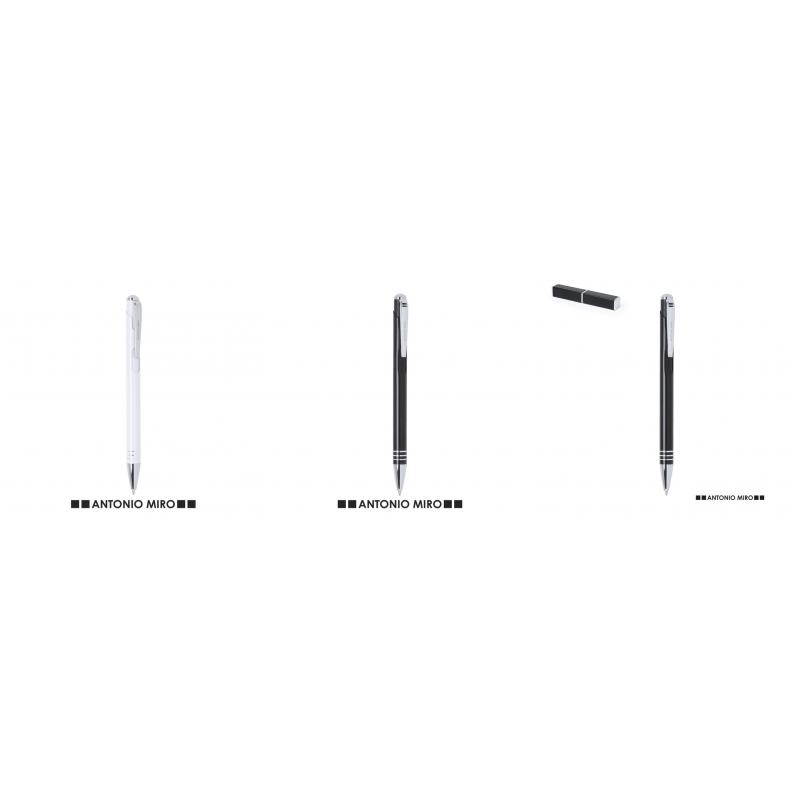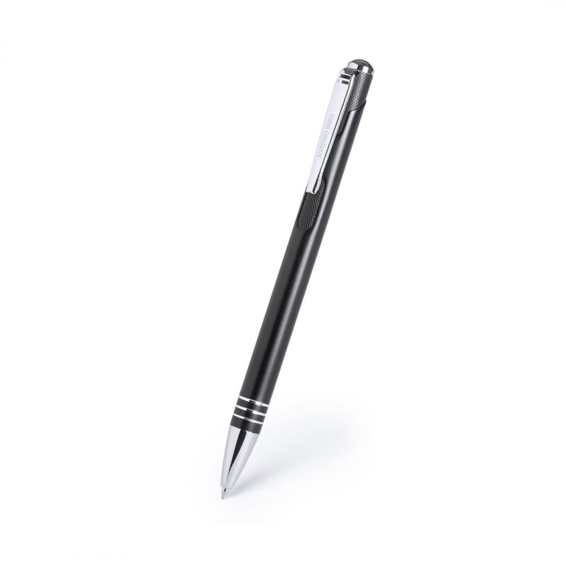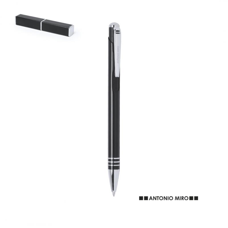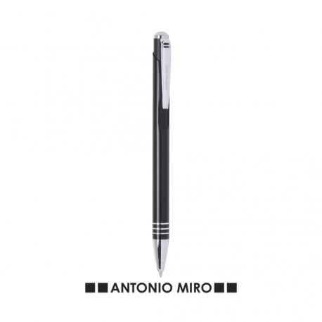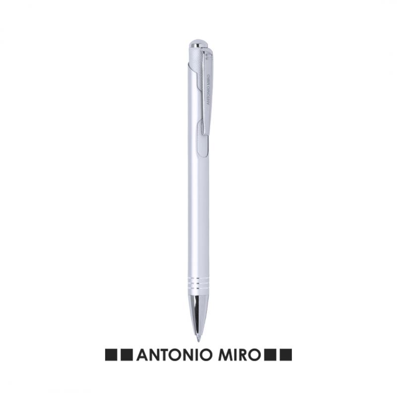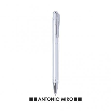Bolígrafo de Antonio Miró de elegante diseño y suave cuerpo en aluminio con accesorios en color plateado. De mecanismo pulsador, con parte superior y troquelado en cuerpo en trama de carbono. Original clip metálico y presentado en estuche individual de aluminio negro con logotipo de la marca. Tinta azul.
