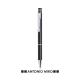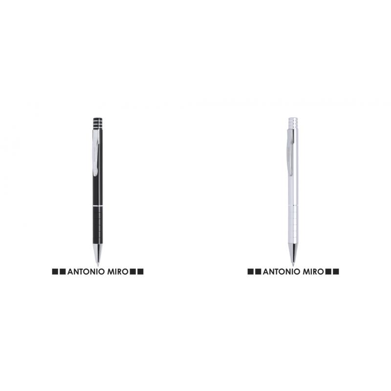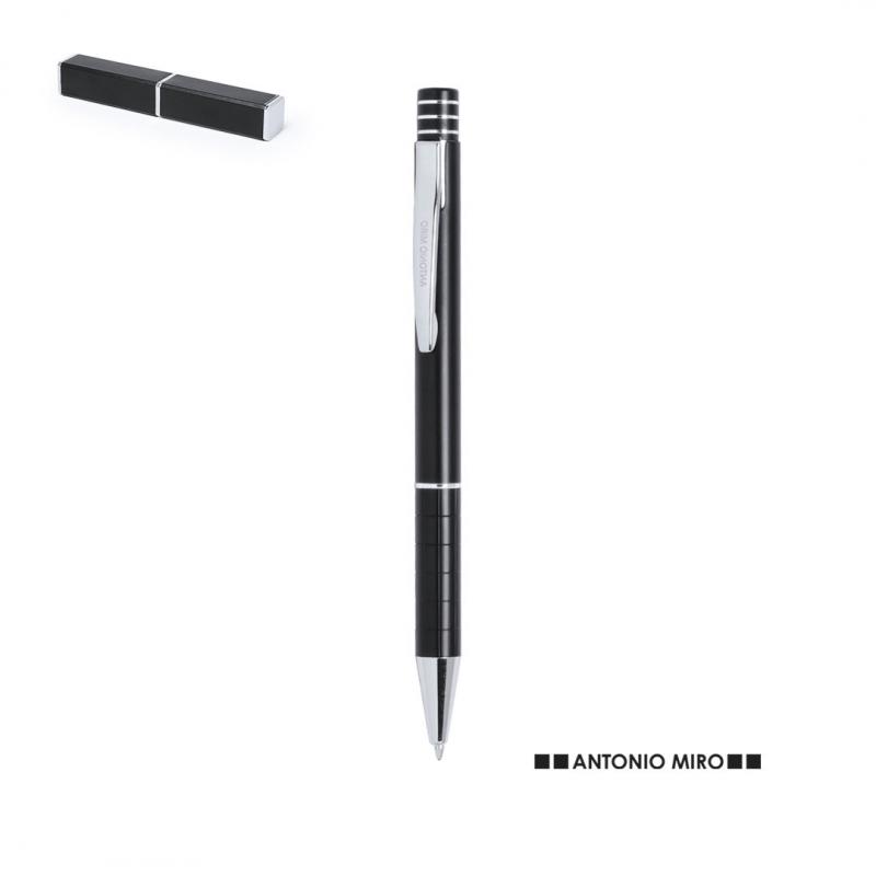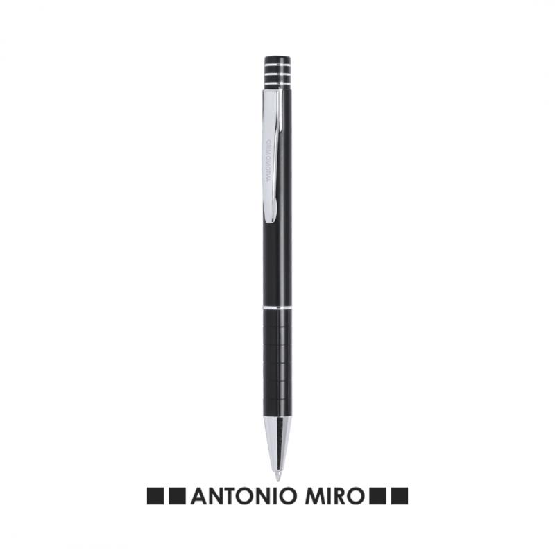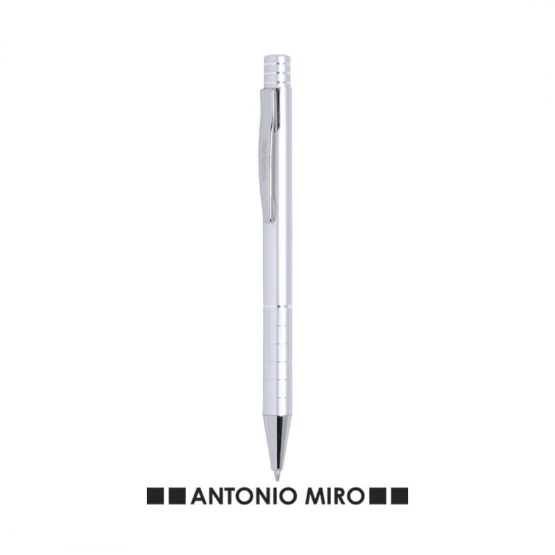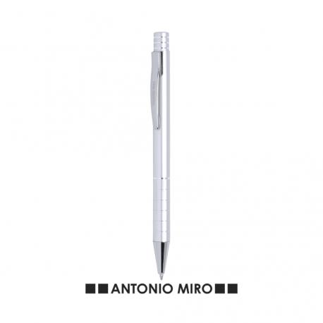 Bolígrafo de Antonio Miró de elegante diseño y suave cuerpo en aluminio con accesorios en color plateado. De mecanismo pulsador, con parte superior anillada, original clip metálico y presentado en estuche individual de aluminio negro con logotipo de la marca. Tinta azul.