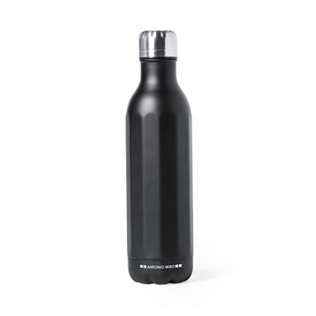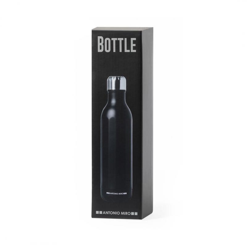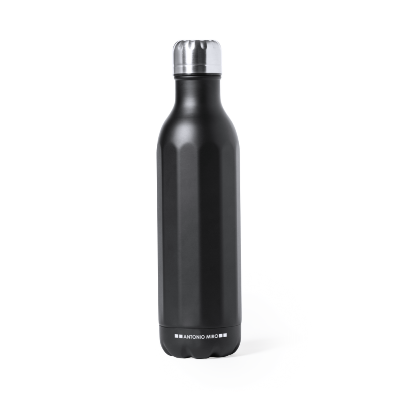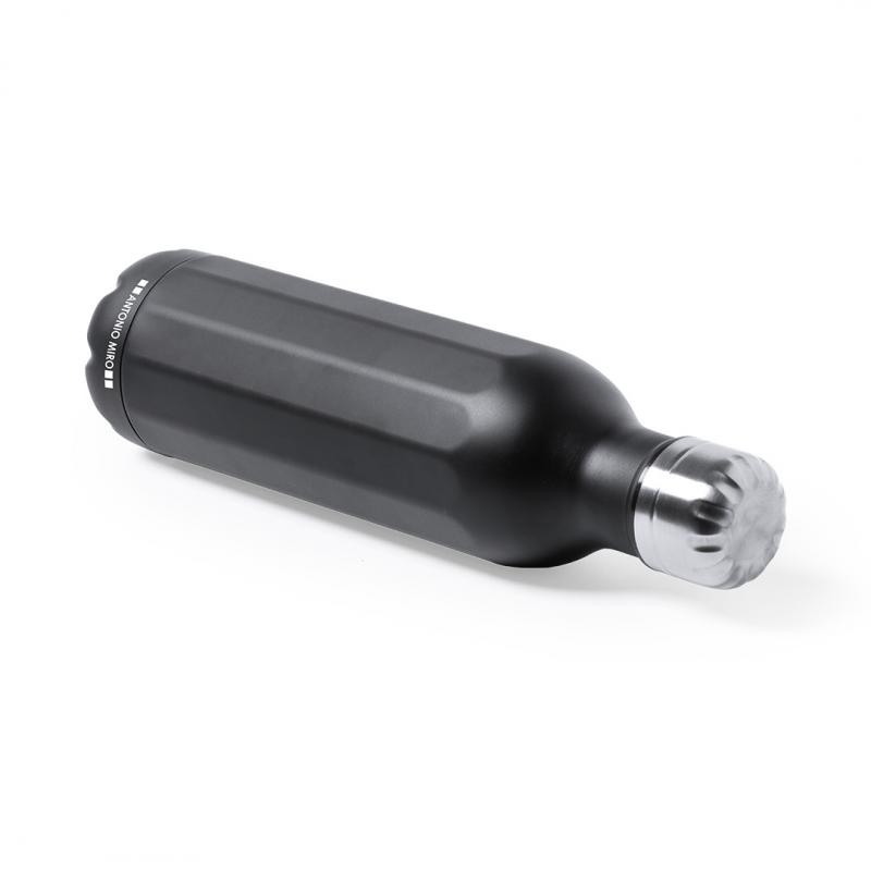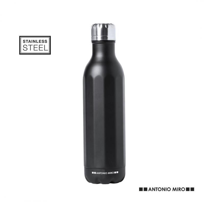 Bidón en acero inox de Antonio Miró. De 750ml de capacidad y sobrio acabado en negro satinado, con cuerpo prisma y logotipo de la marca en la base. Con tapón cromado a rosca y presentado en atractiva caja de diseño con logotipo de la marca.