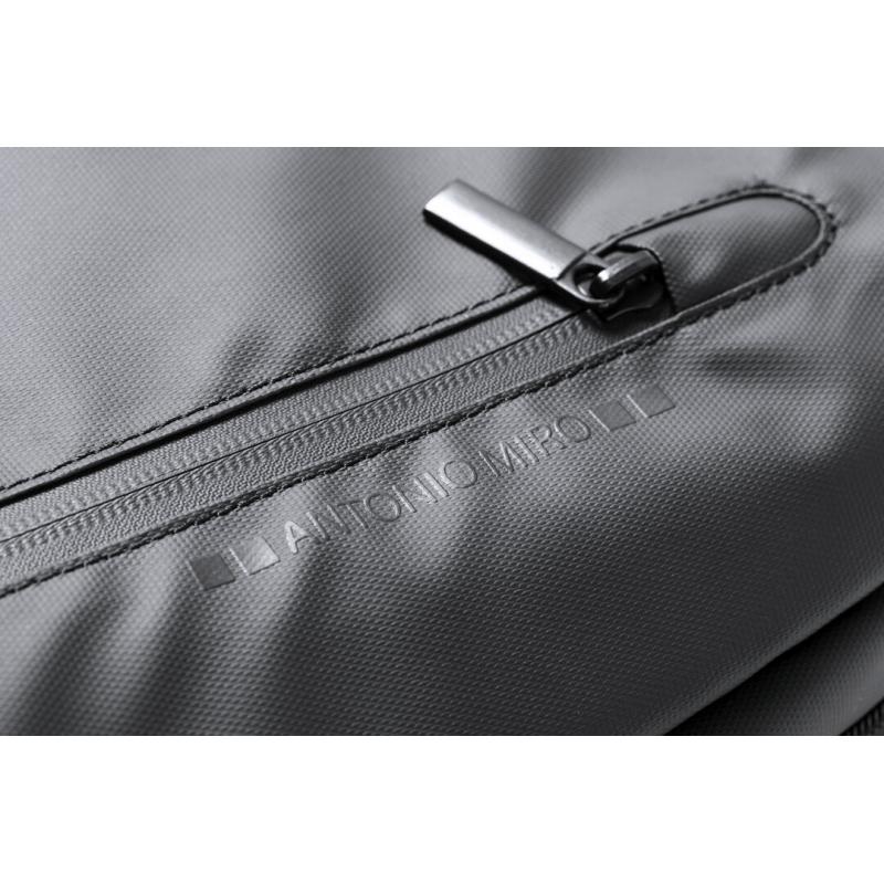 Mochila de Antonio Miró de calidad premium en resistente poliéster 600D de sobrio diseño en color negro. Con cierre de cremallera, bolsillo frontal y asa reforzada metálica. Con acolchado ergonómico en espalda y cintas de hombros, incluye compartimento interior acolchado para portátil de hasta 15 pulgadas y para tablets de hasta 10 pulgadas. Fundas interiores para bolígrafos y smartphone. Con logotipo de la marca en frontal.