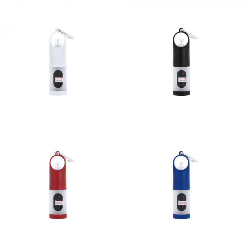 Dispensador de bolsas para mascotas con resistente cuerpo en ABS y compartimento recargable para gel hidroalcohólico -incluye gel-. Equipado con mosquetón metálico para fácil transporte. Incluye gel hidroalcohólico de 15ml y 15 bolsas.
